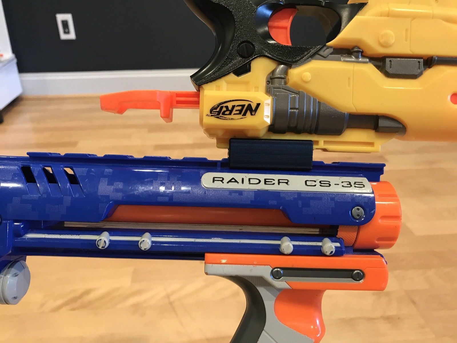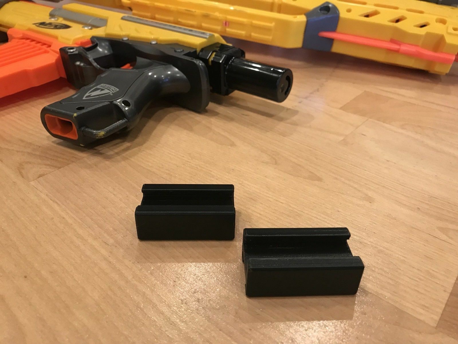 These little devices will securely connect two nerf guns together using the rail connector. Simply slide on to the two guns you wish to connect and go to war. Holds securely and tightly. Some rails may have a snug fit and require a strong pull to put in place.
