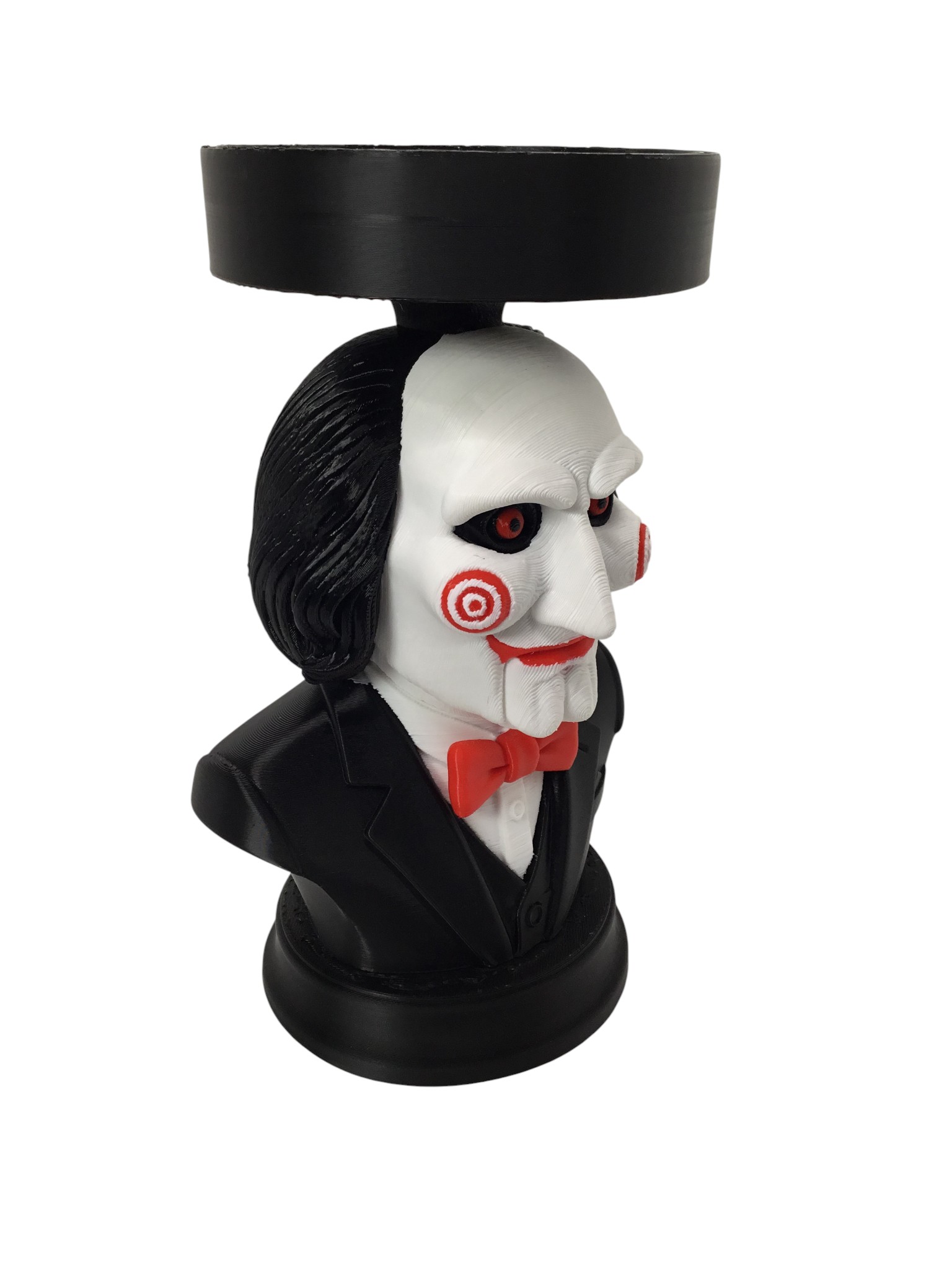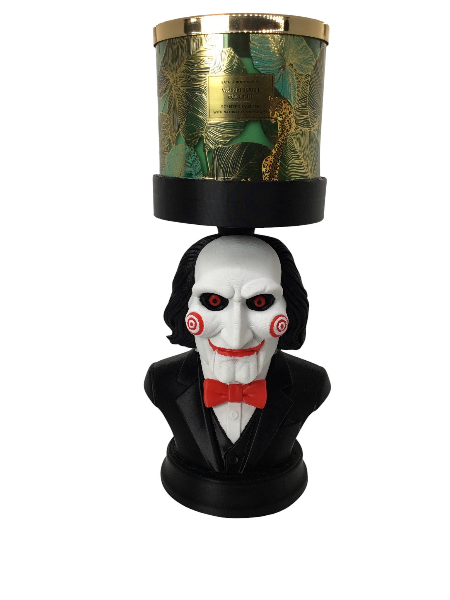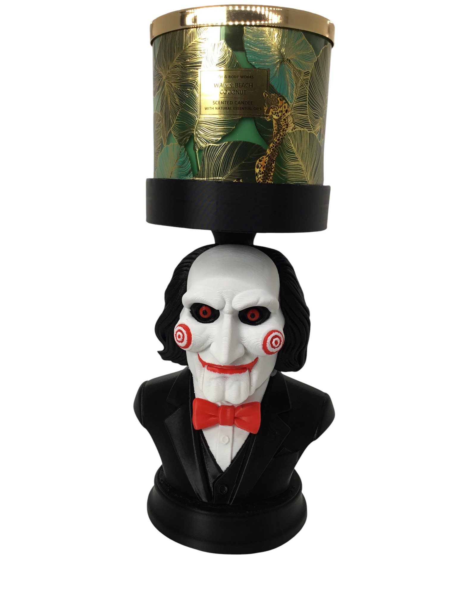 Bring chilling charm to your horror collection with this custom Billy from Saw candle and storage holder. This 3D-printed bust features Billy’s iconic red spiral cheeks, haunting eyes, black suit, and bow tie—topped with a flat platform designed to hold standard jar candles, planters, containers, or small décor pieces. Standing approx. 9″ tall x 6″ wide x 4.75″ deep, it works perfectly as a spooky centerpiece for shelves, desks, horror displays, or Halloween setups. The sturdy construction makes it great for Bath & Body Works 3-wick candles and similar sizes. A unique gift for horror fans, collectors, and anyone who loves movie-inspired décor. Add a touch of sinister style to your space and let Billy hold your favorite candle! Candle not included..