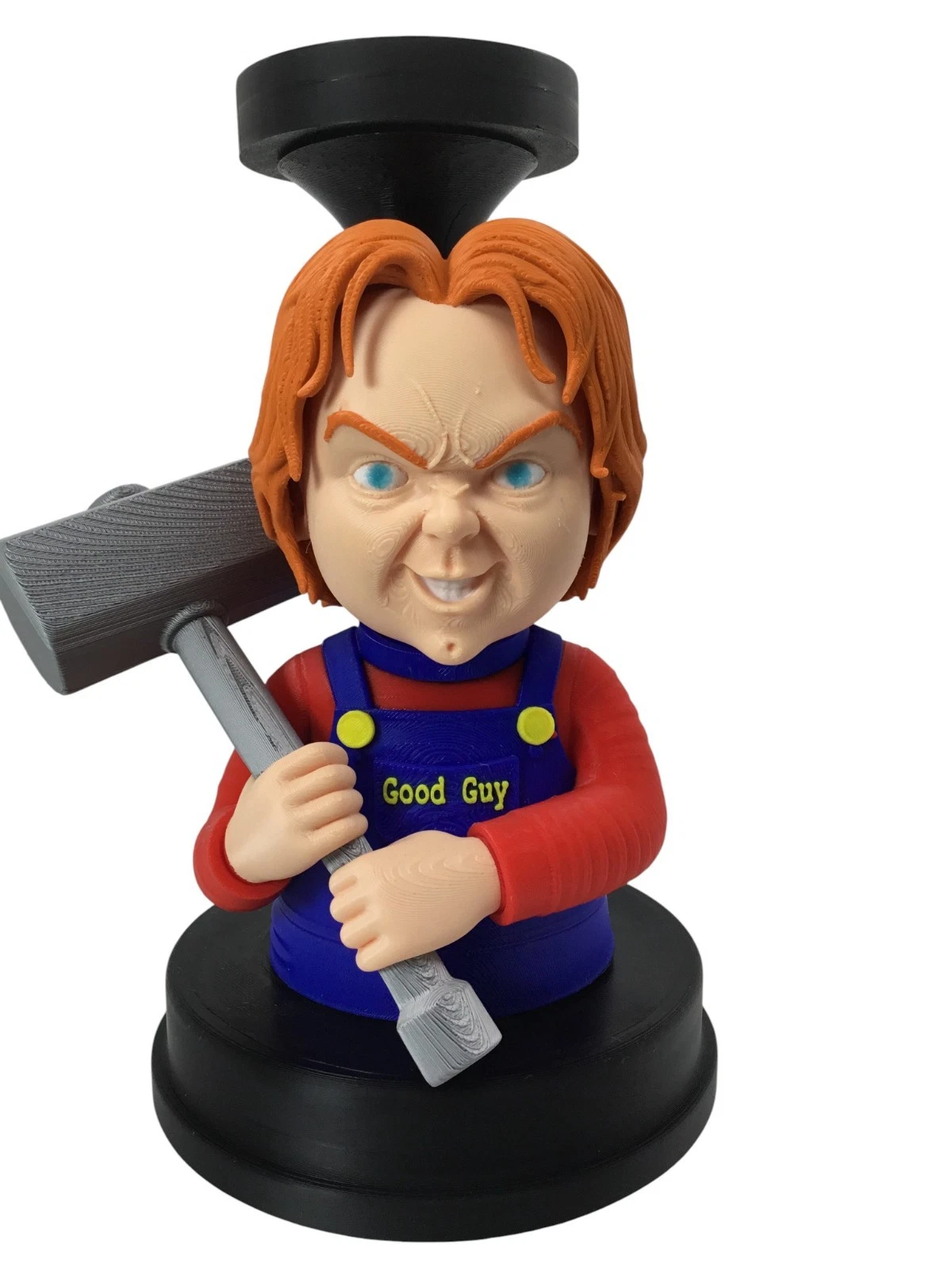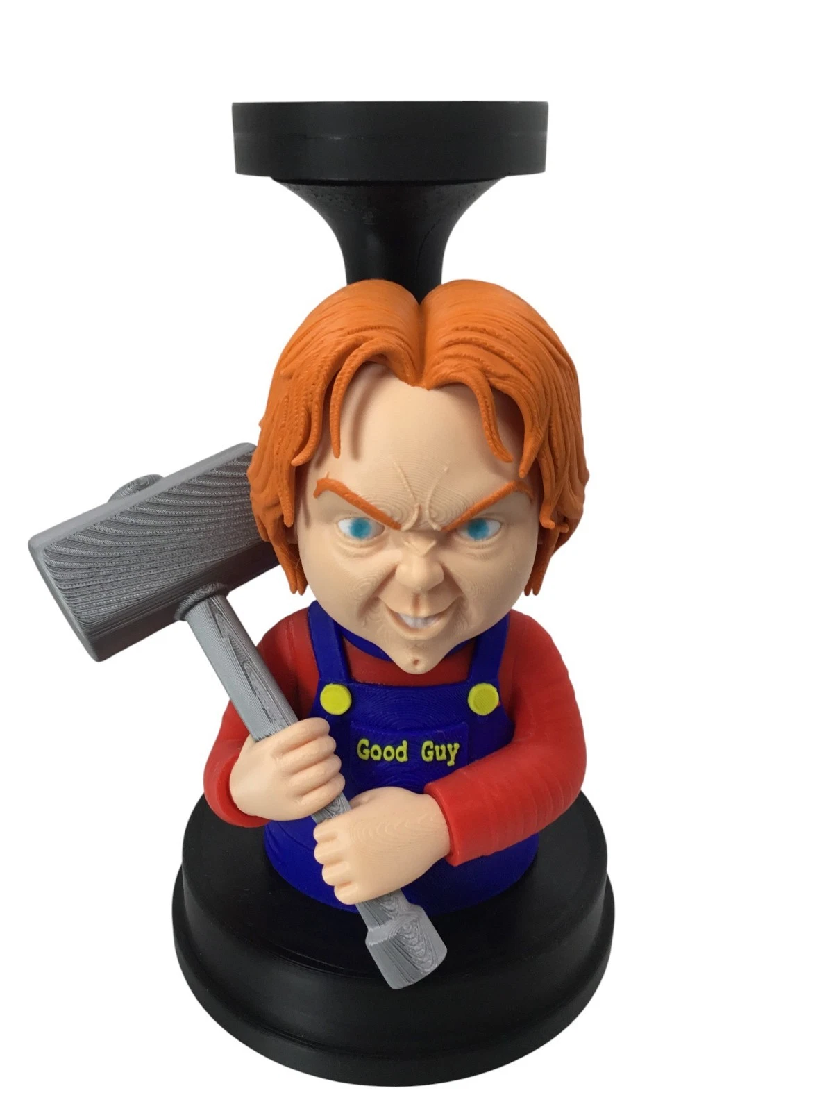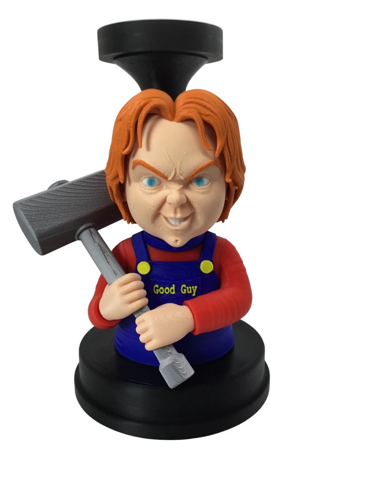 Add a killer touch to your décor with this Chucky Candle Holder inspired by the Child’s Play horror classic. Expertly 3D printed and hand-finished, this piece captures Chucky’s menacing grin, fiery orange hair, and signature Good Guy overalls as he wields a giant hammer — the perfect mix of creepy and nostalgic. Designed to fit single-wick Bath & Body Works candles, it also works great for small plants, figurines, or collectibles. Measuring approximately 9¼” high x 7″ wide x 5¼” deep, this display stand makes an unforgettable centerpiece for horror fans and Halloween lovers alike. Candle not included..