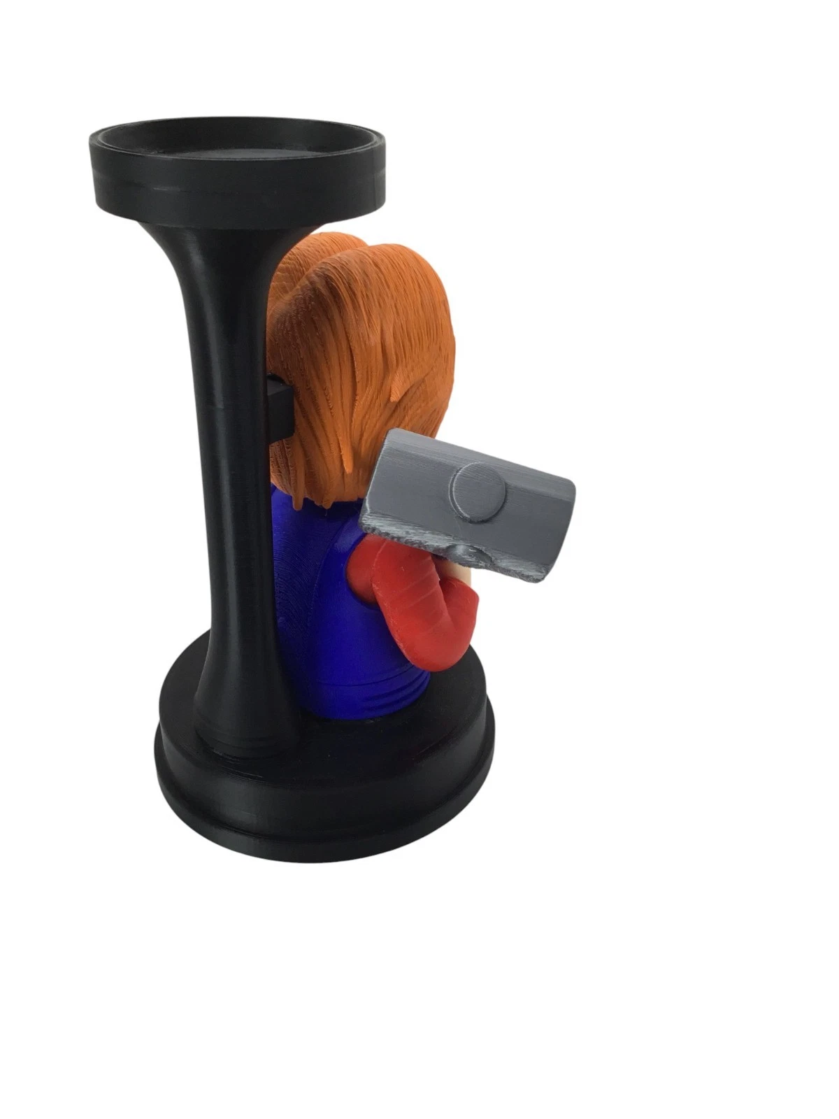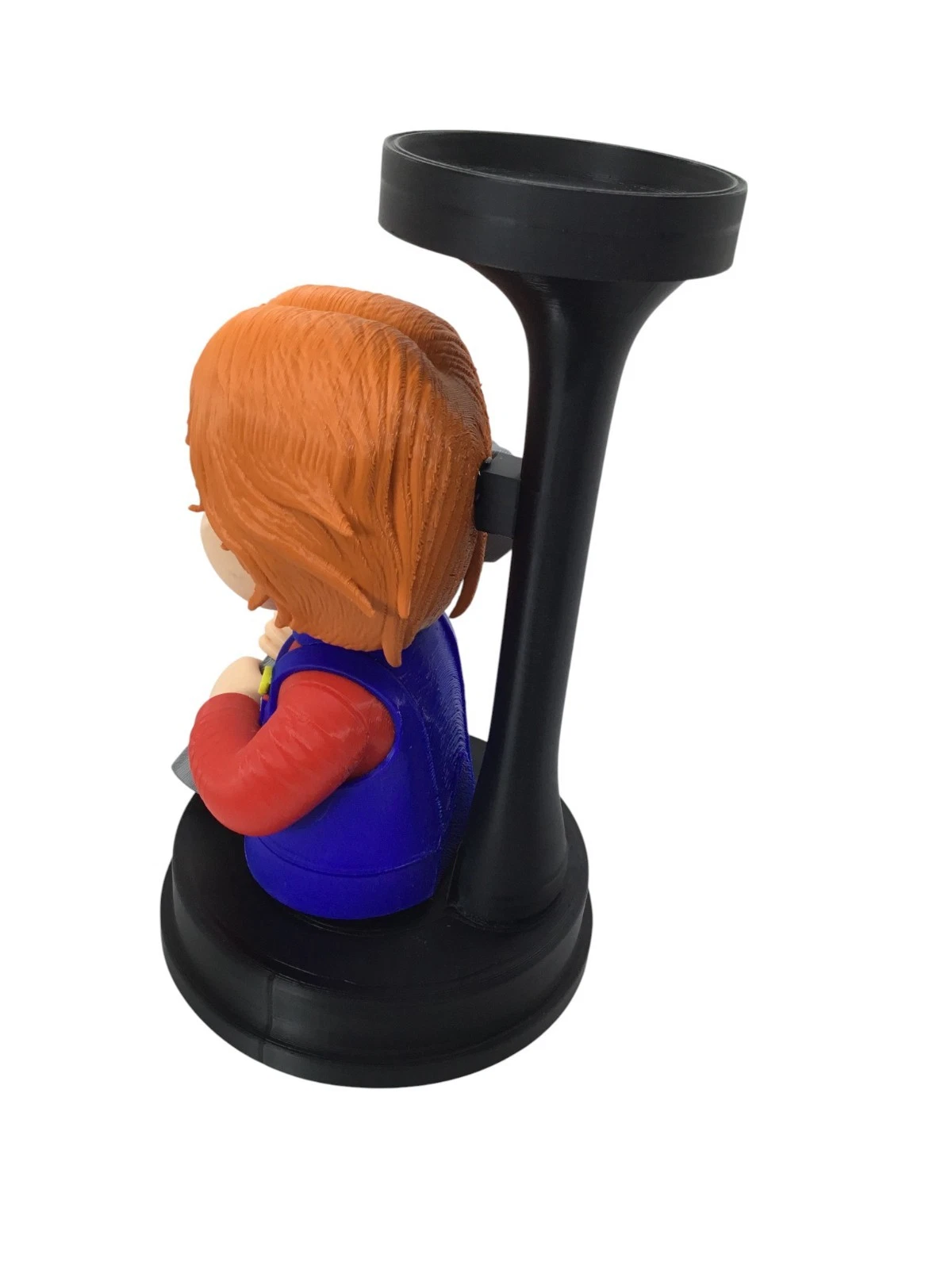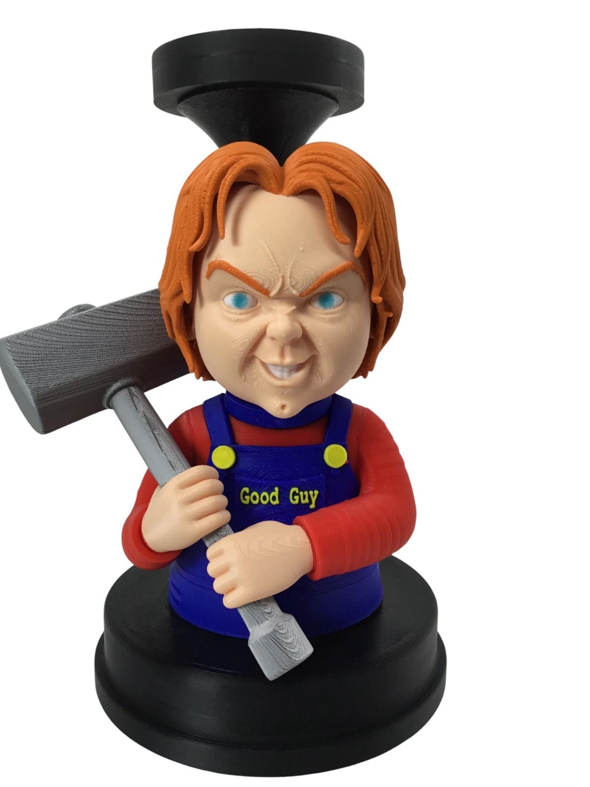 Add a killer touch to your décor with this Chucky Candle Holder inspired by the Child’s Play horror classic. Expertly 3D printed and hand-finished, this piece captures Chucky’s menacing grin, fiery orange hair, and signature Good Guy overalls as he wields a giant hammer — the perfect mix of creepy and nostalgic. Designed to fit single-wick Bath & Body Works candles, it also works great for small plants, figurines, or collectibles. Measuring approximately 9¼” high x 7″ wide x 5¼” deep, this display stand makes an unforgettable centerpiece for horror fans and Halloween lovers alike. Candle not included..