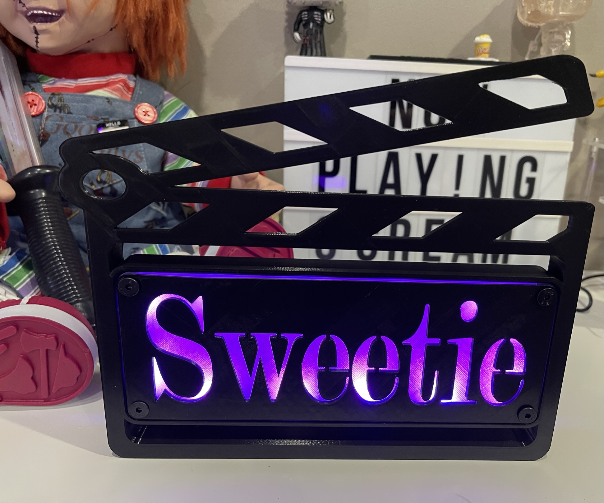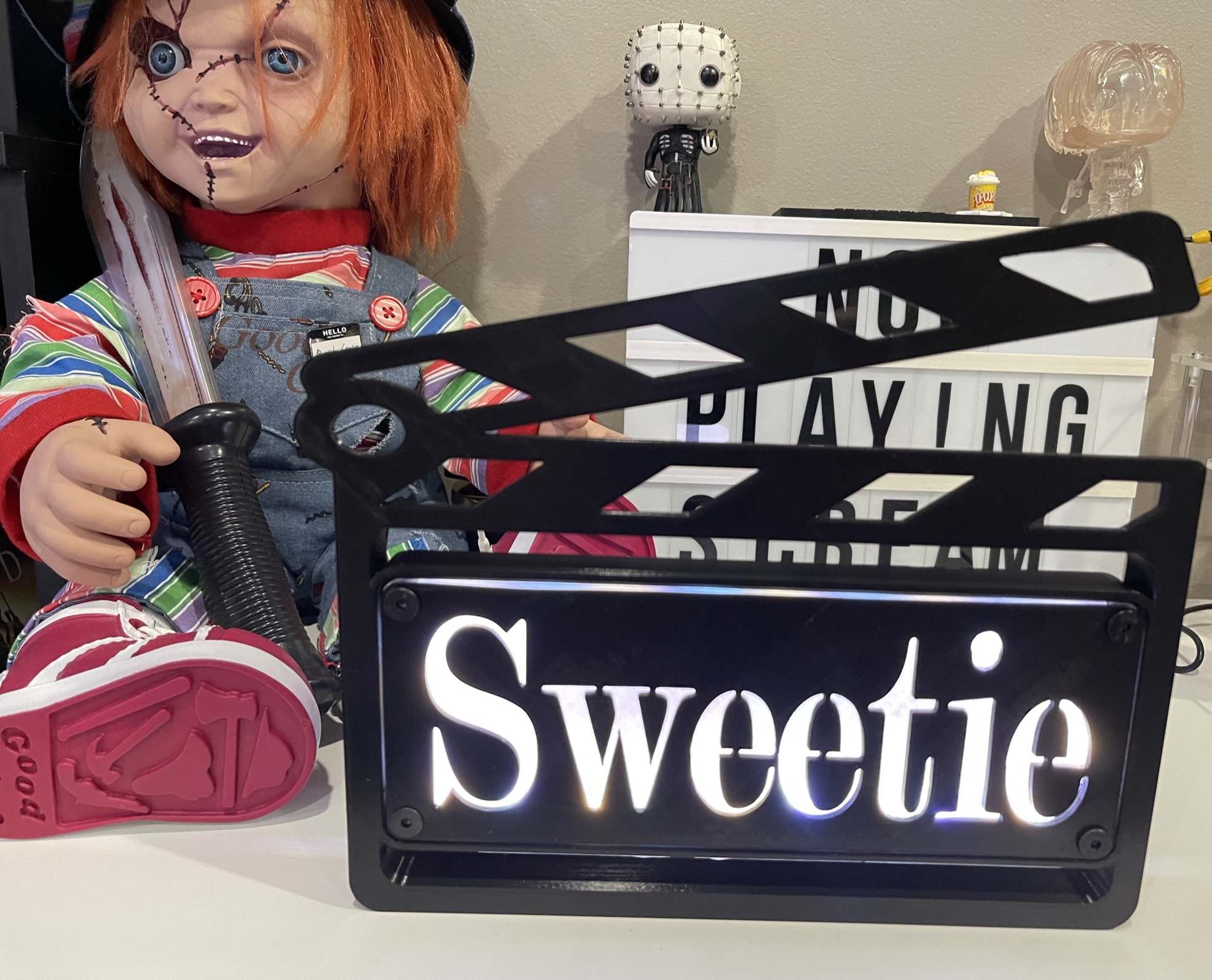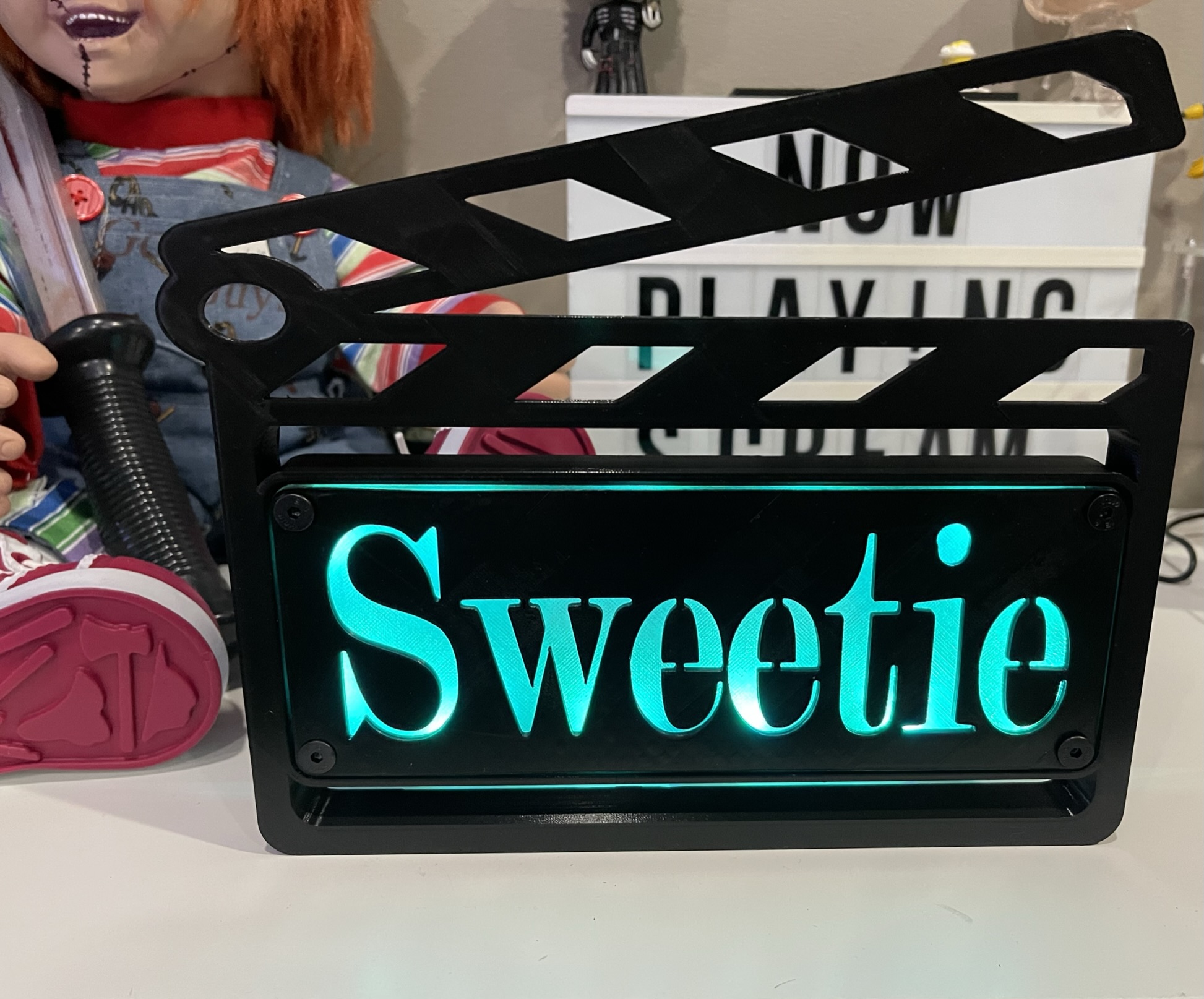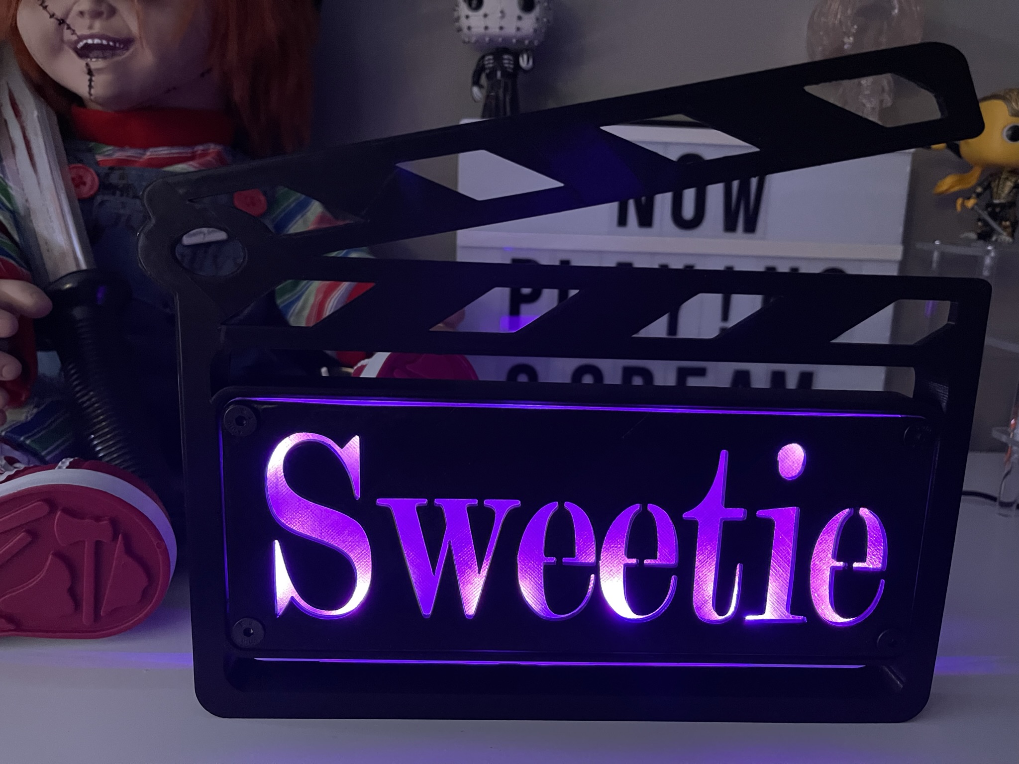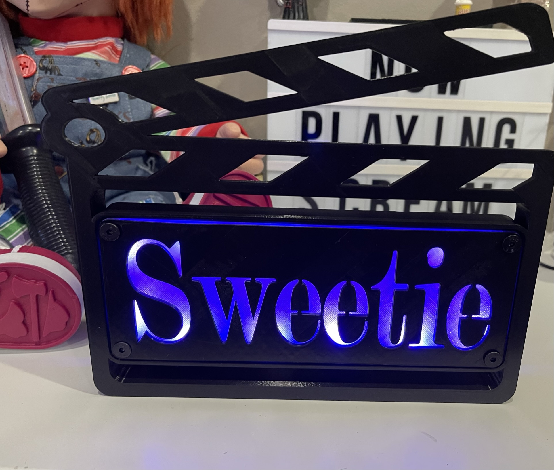 This is for a custom LED Clapboard Desktop Sign. Comes with Remote Control to Change to any color you like. You can also change settings to FADE, FLASH, STROBE, or SMOOTH to transition through all colors.
