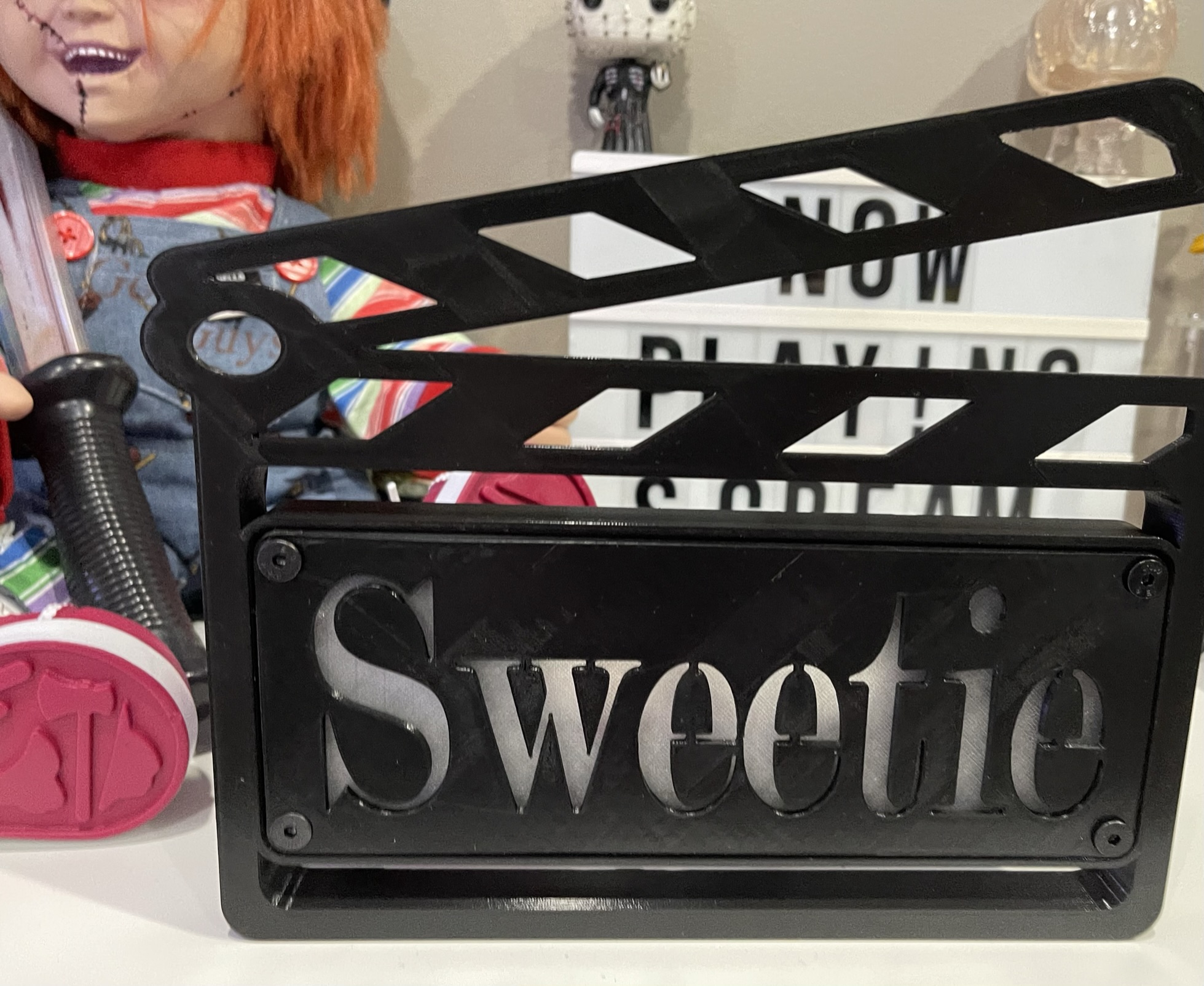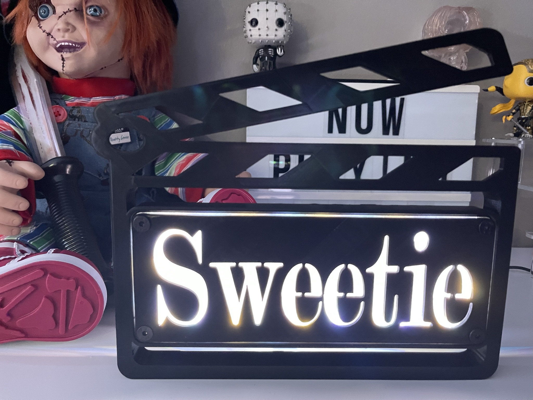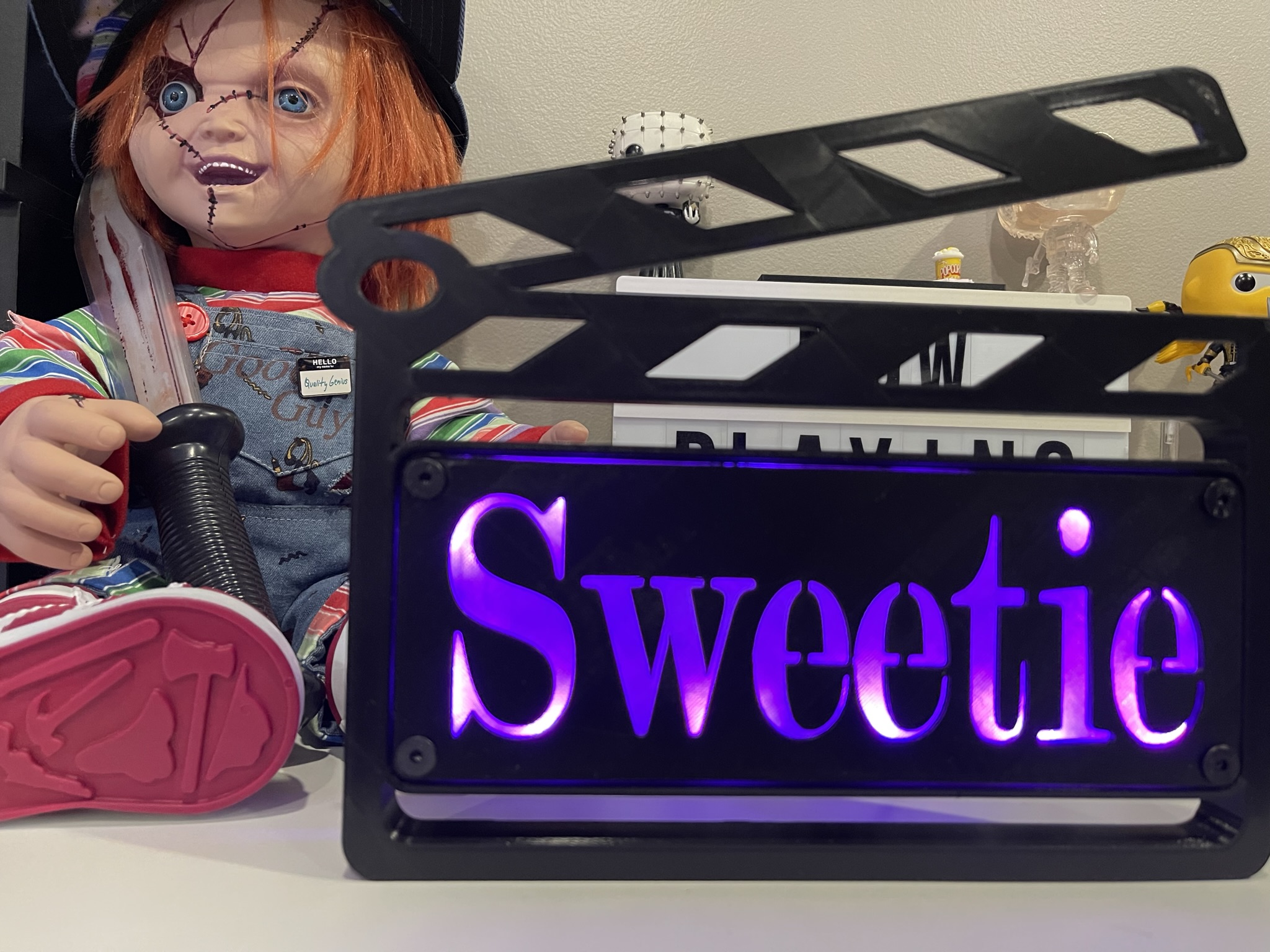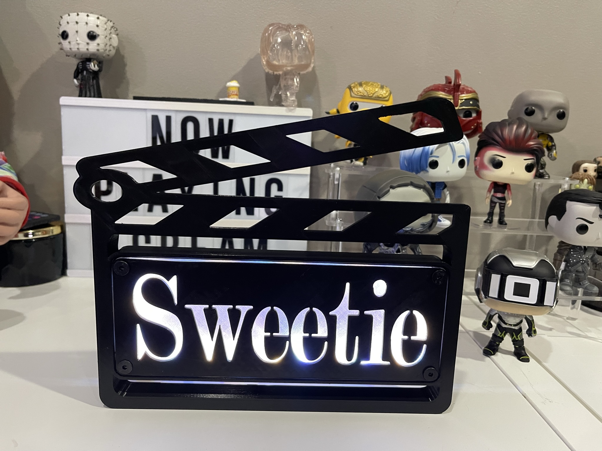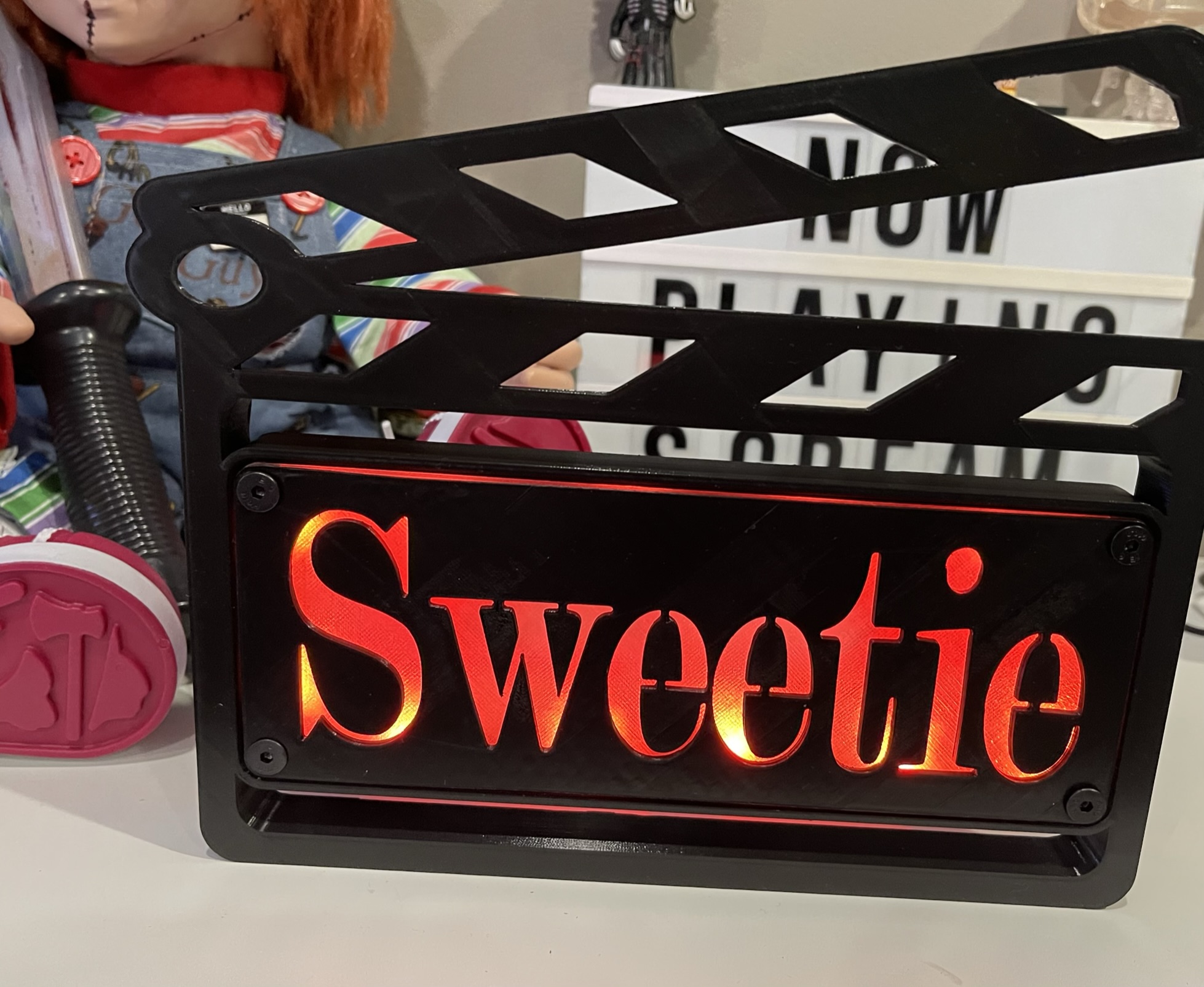 This is for a custom LED Clapboard Desktop Sign. Comes with Remote Control to Change to any color you like. You can also change settings to FADE, FLASH, STROBE, or SMOOTH to transition through all colors.