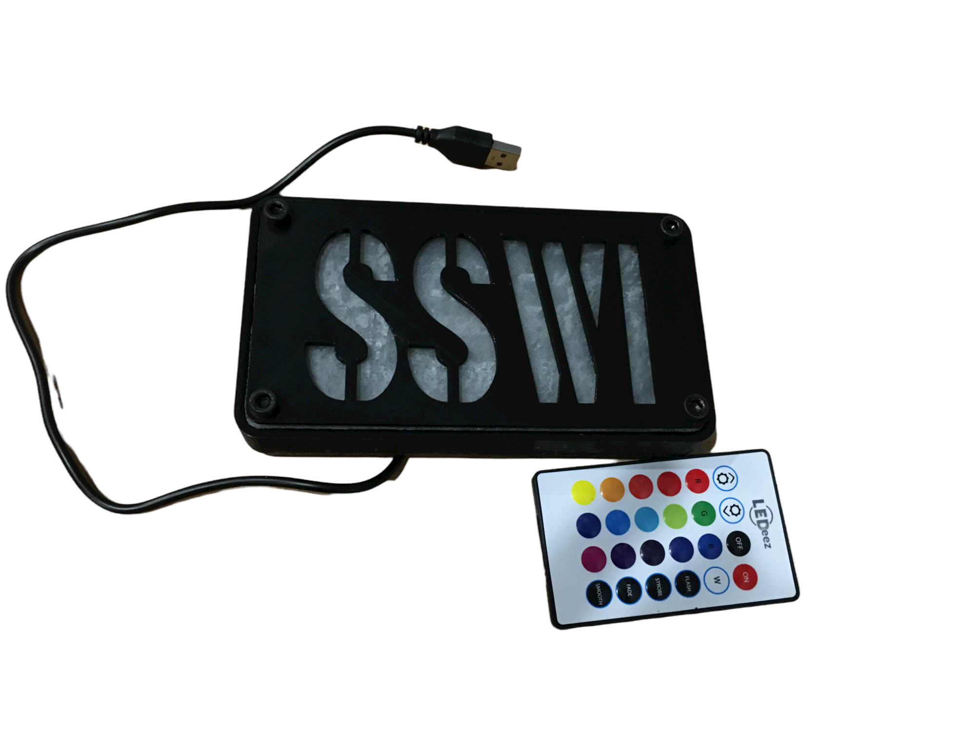 This is for a custom LED BOX Desktop or Wall Sign. Comes with Remote Control to Change to any color you like. You can also change settings to FADE, FLASH, STOBE or SMOOTH to transition through all colors.
