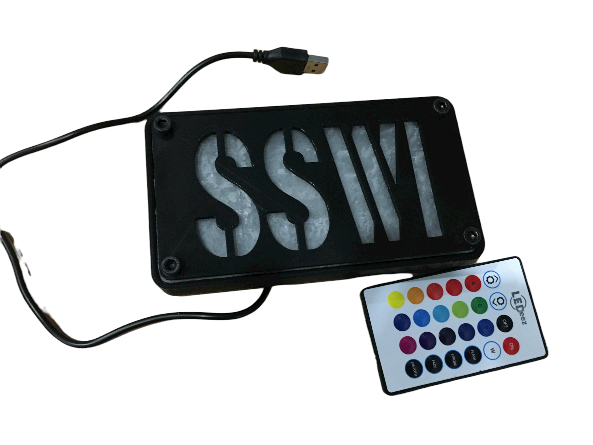 Custom LED Sign Package Listing includes your custom name, Which would replace SSWI as Shown in the photos (Box Measures 6 1/4″ W x 3 1/2″ H x 1″ D, 32″ USB Powered cord to plug into any USB powered device (Laptop, Desktop, Power Cord etc.), and The LED Changing Remote. The Basic Package does not include the extension cable or Wall Adapter – This will plug in with the 32″ USB Only. This will plug into any power adapter you may already have that takes USB and can be powered that way. Also can plug directly into your PC or Laptop to Power..