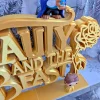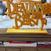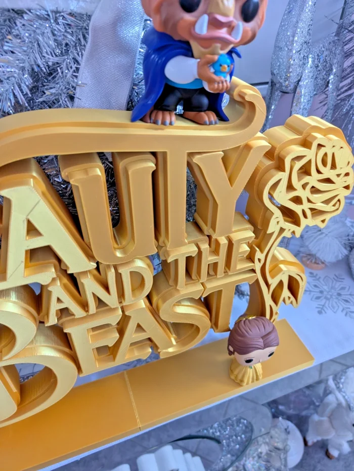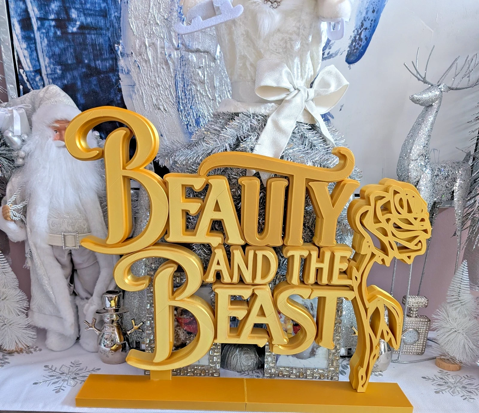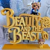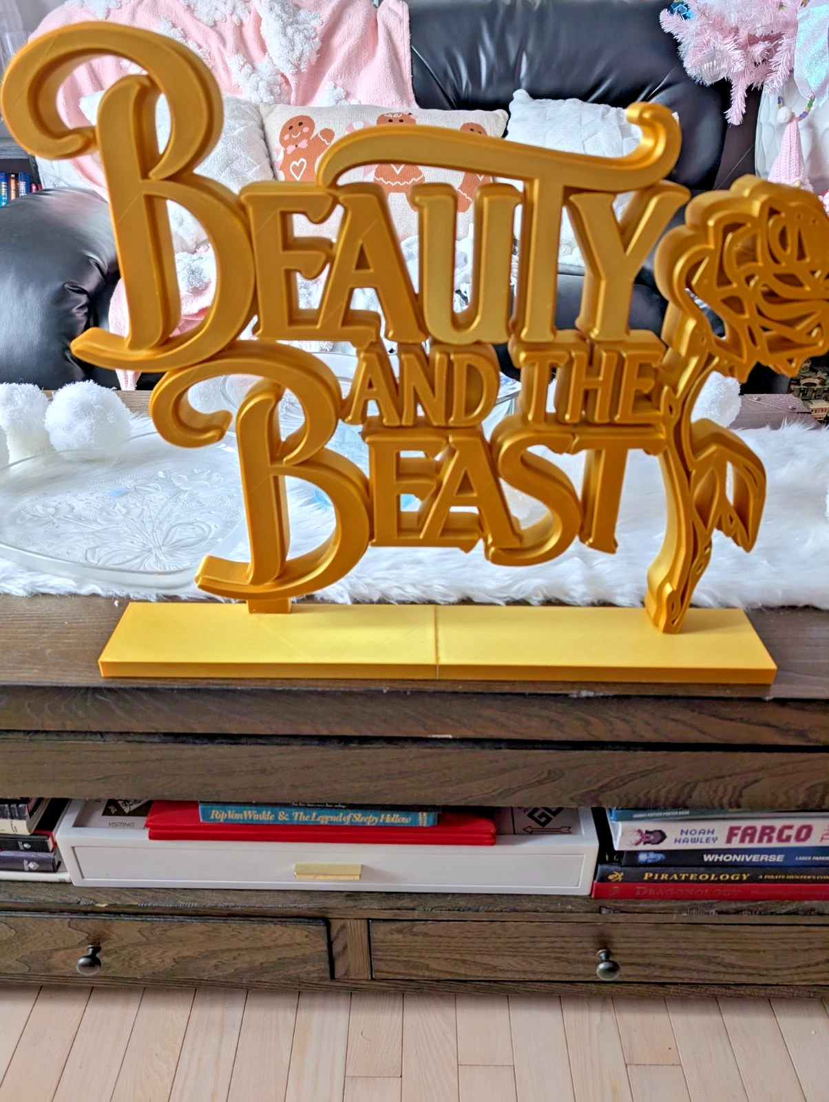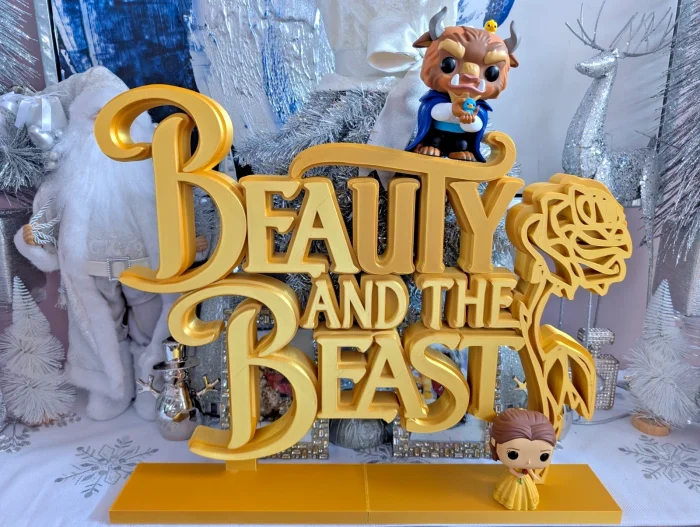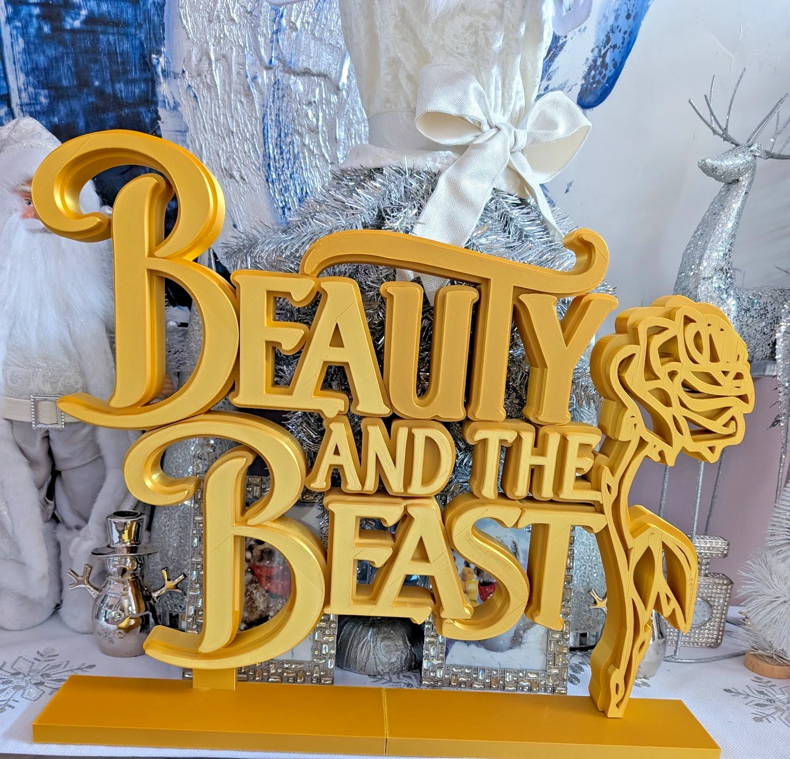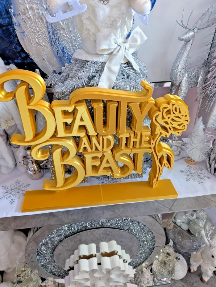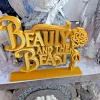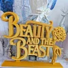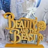 Beautiful “Beauty and the Beast” decorative display sign featuring an elegant gold finish and detailed rose design inspired by the beloved fairytale. This large statement piece showcases ornate lettering with a stylized enchanted rose on the side, making it perfect for Disney fans, themed rooms, collectors, or event décor.