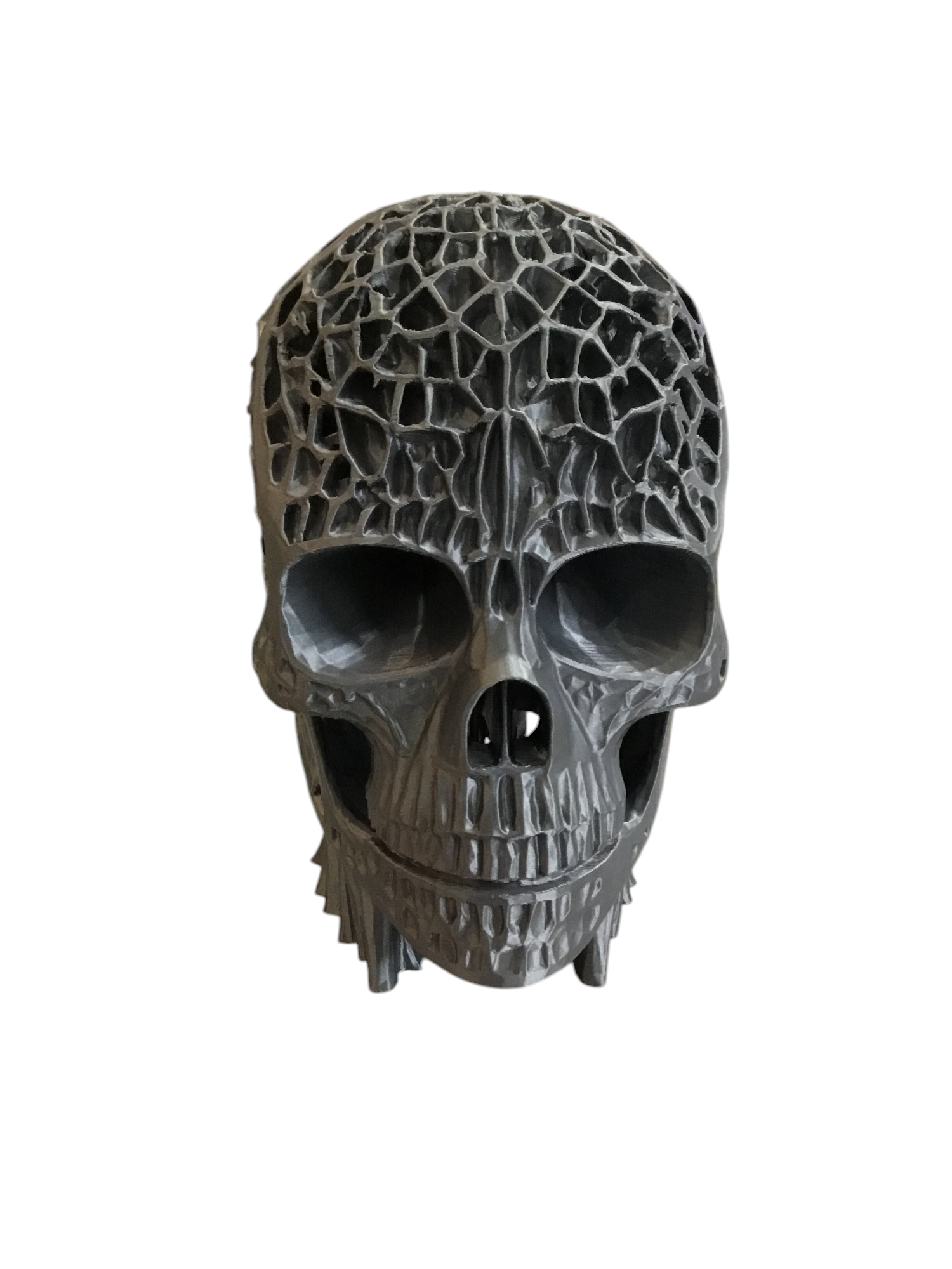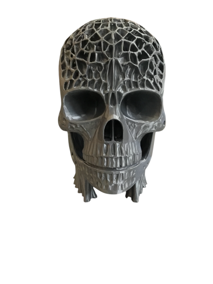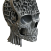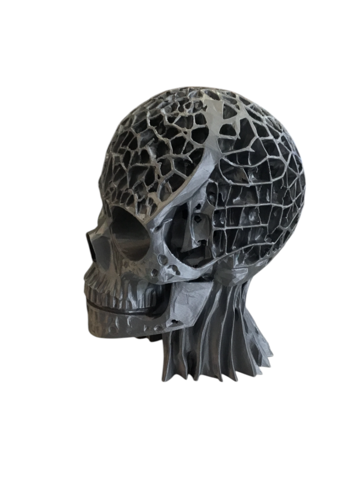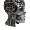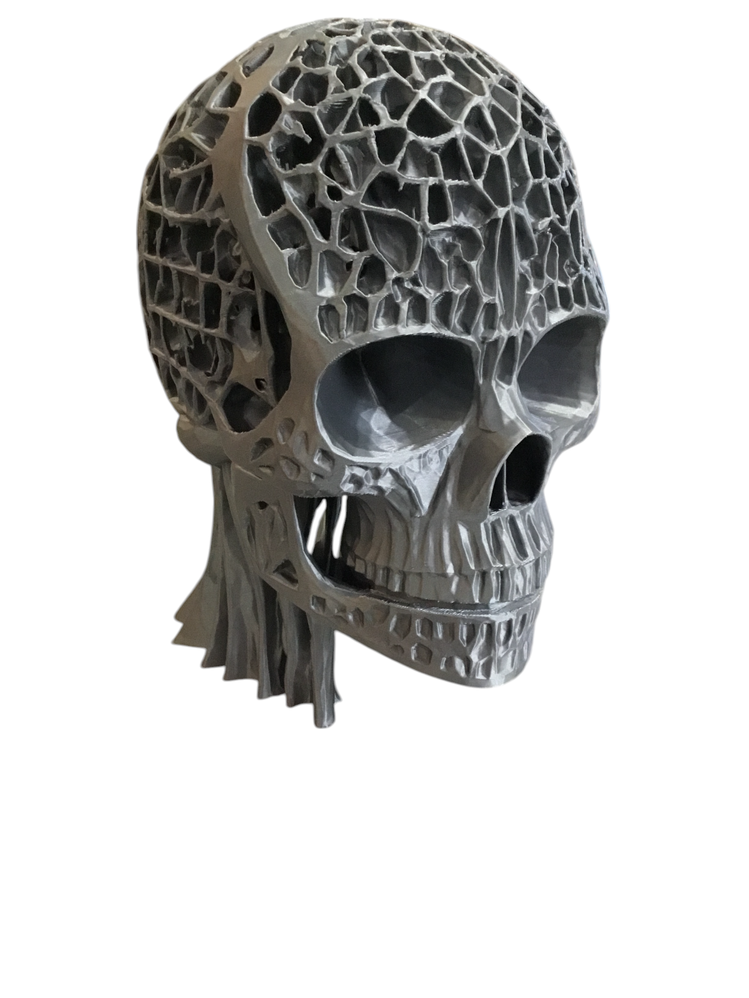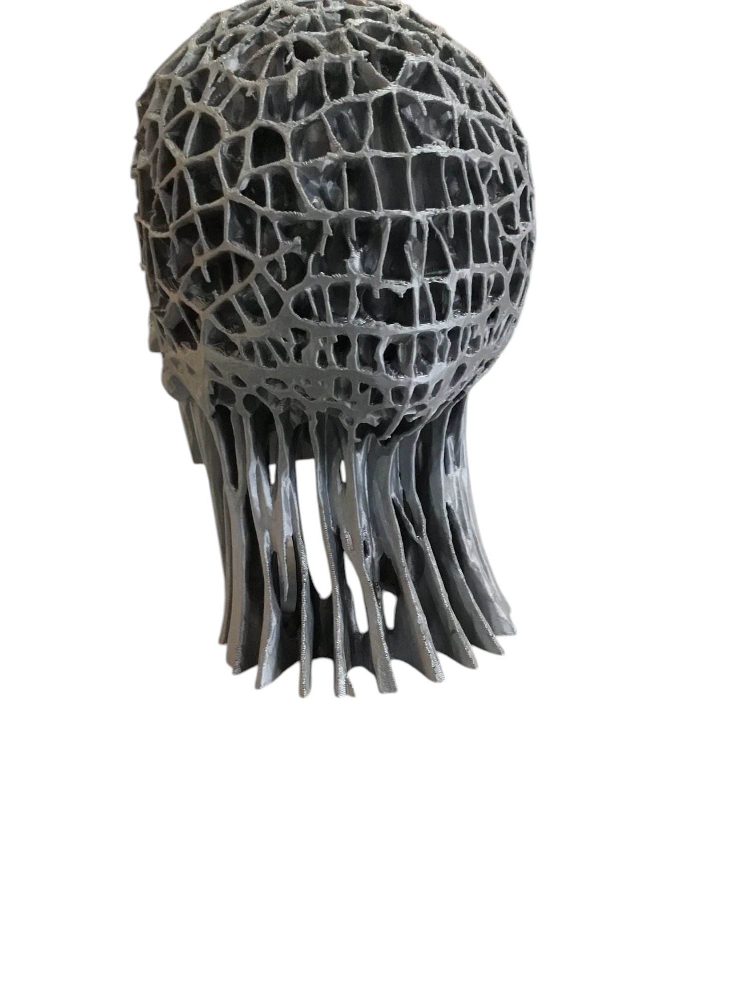 Elevate your space with this stunningly intricate, futuristic skull sculpture. Crafted with a bold, geometric lattice design, this one-of-a-kind statement piece blends dark elegance with modern artistry.