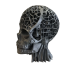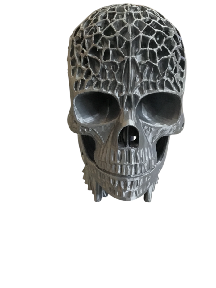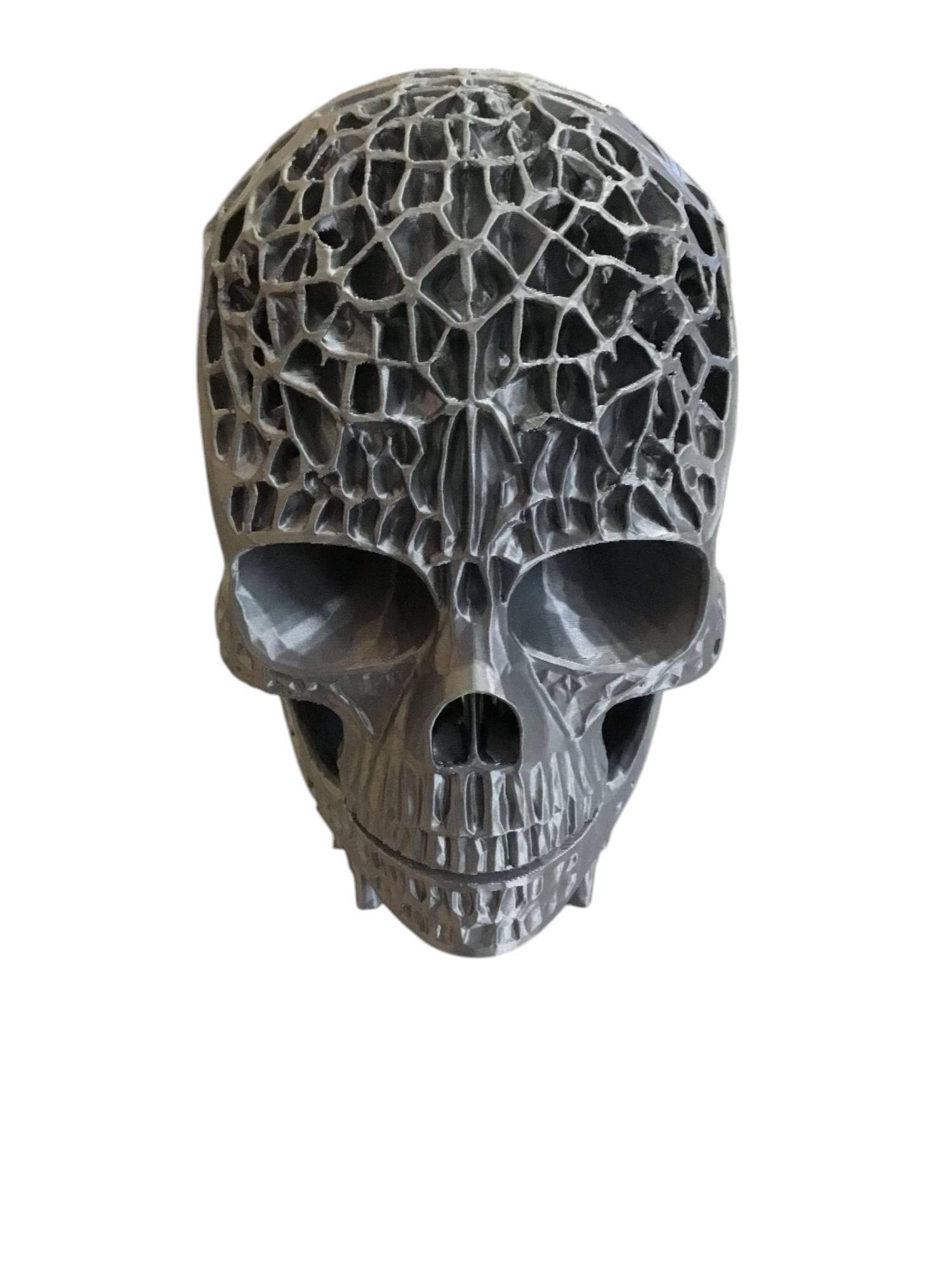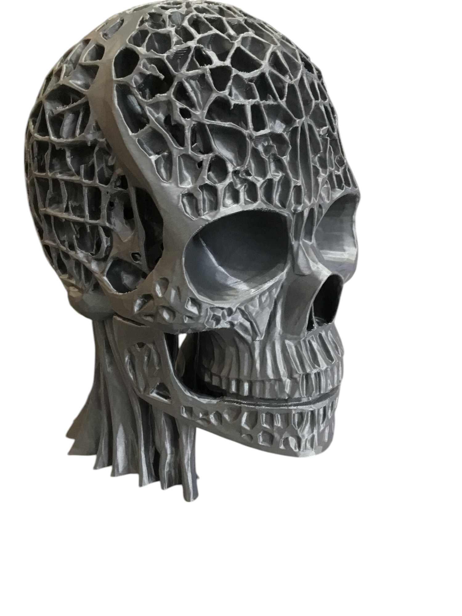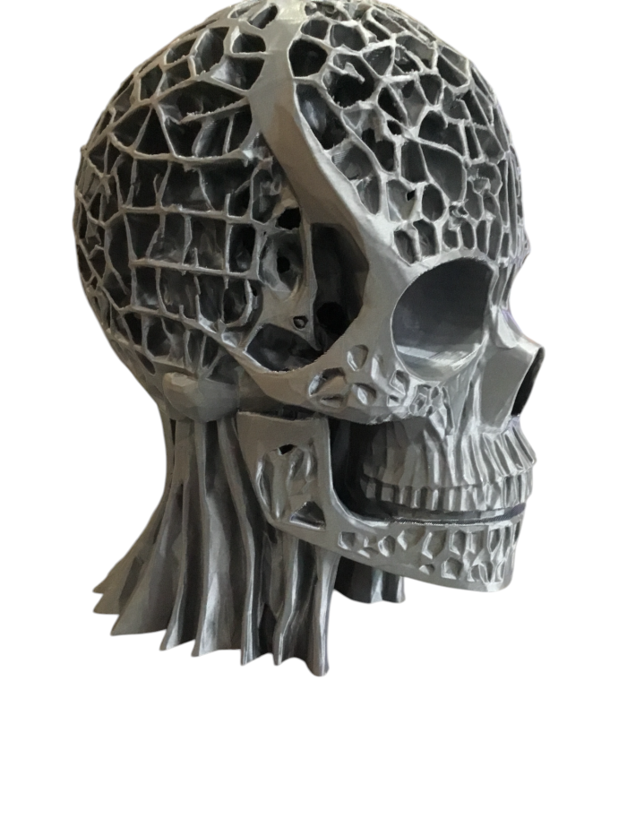 Elevate your space with this stunningly intricate, futuristic skull sculpture. Crafted with a bold, geometric lattice design, this one-of-a-kind statement piece blends dark elegance with modern artistry.