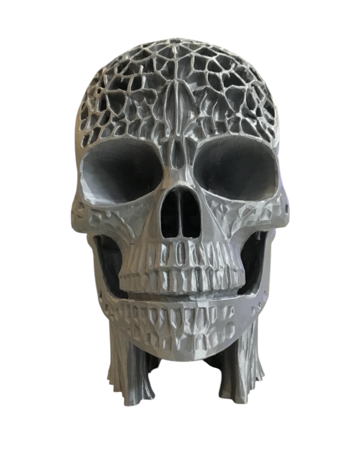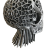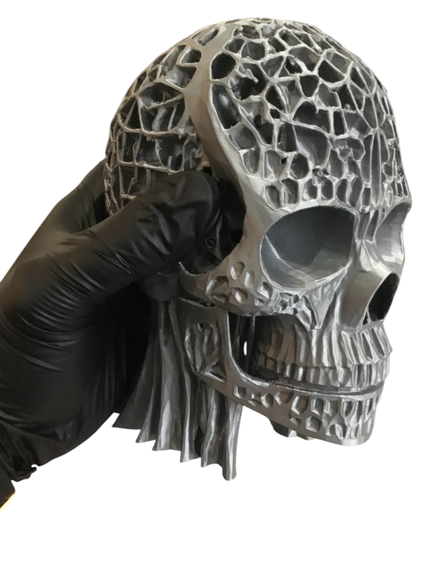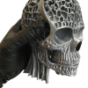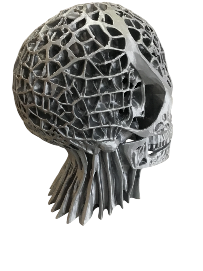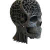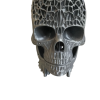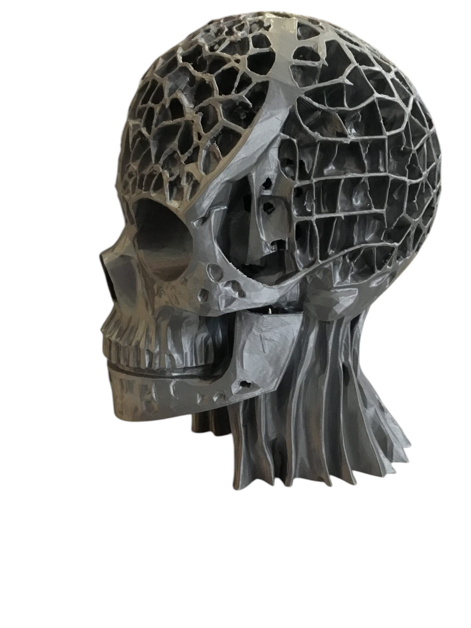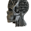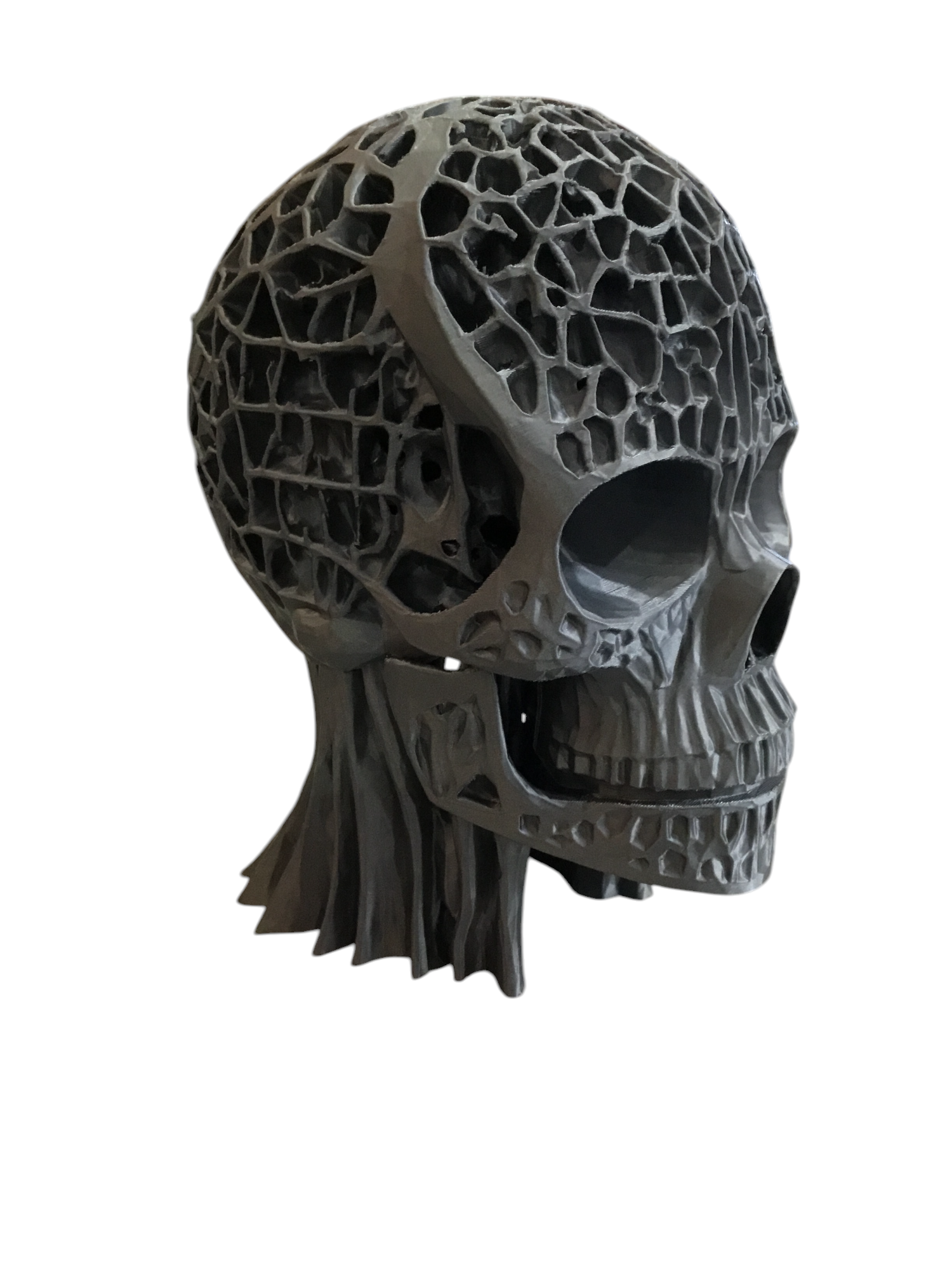 Elevate your space with this stunningly intricate, futuristic skull sculpture. Crafted with a bold, geometric lattice design, this one-of-a-kind statement piece blends dark elegance with modern artistry.
