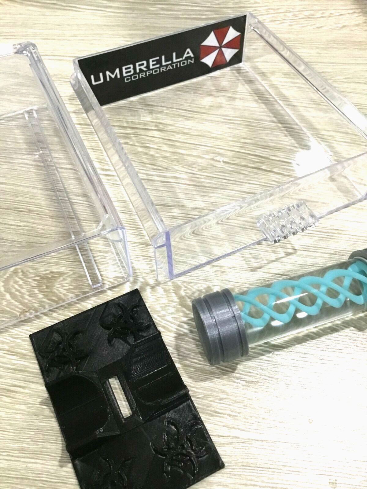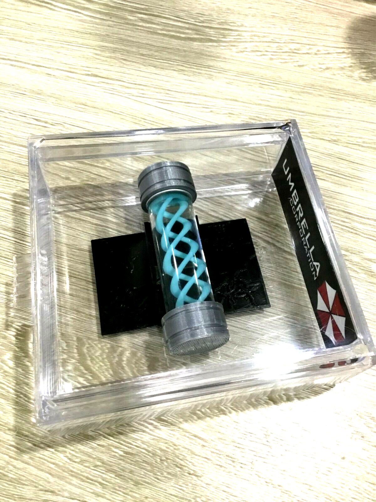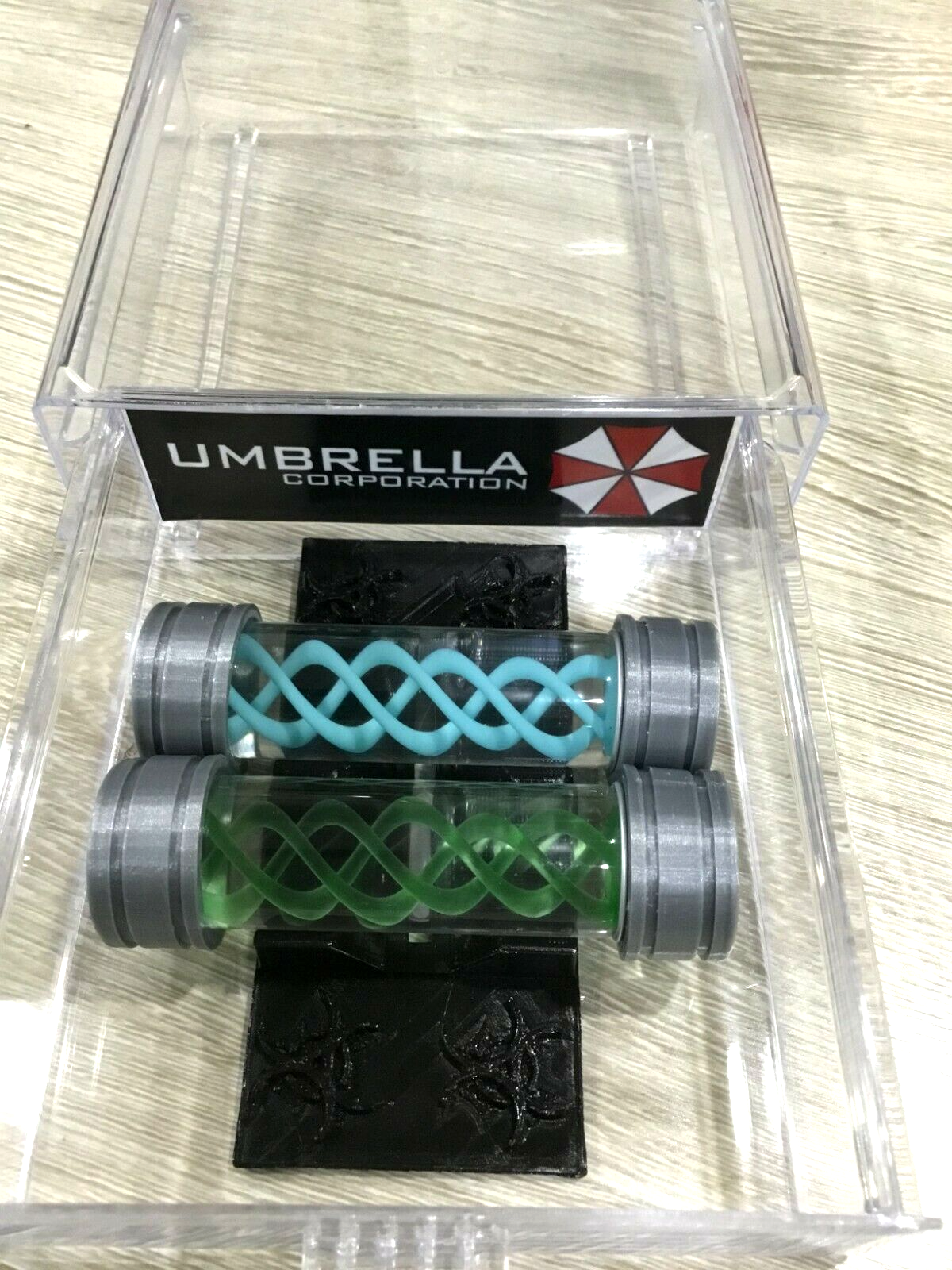 Props Come structured in a 20ml Sealed Borosilicate Leak Proof Glass Vial. Also comes with a Display Stand and Display case With Pull Our Drawer stamped with the Famous Umbrella Corporation.