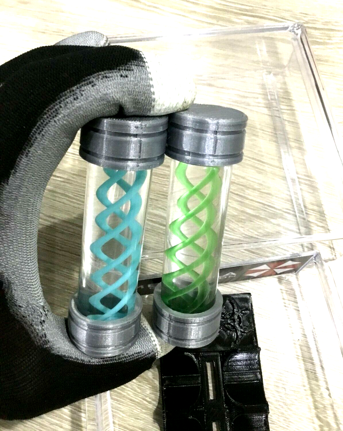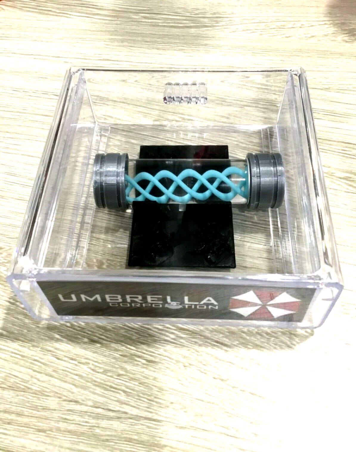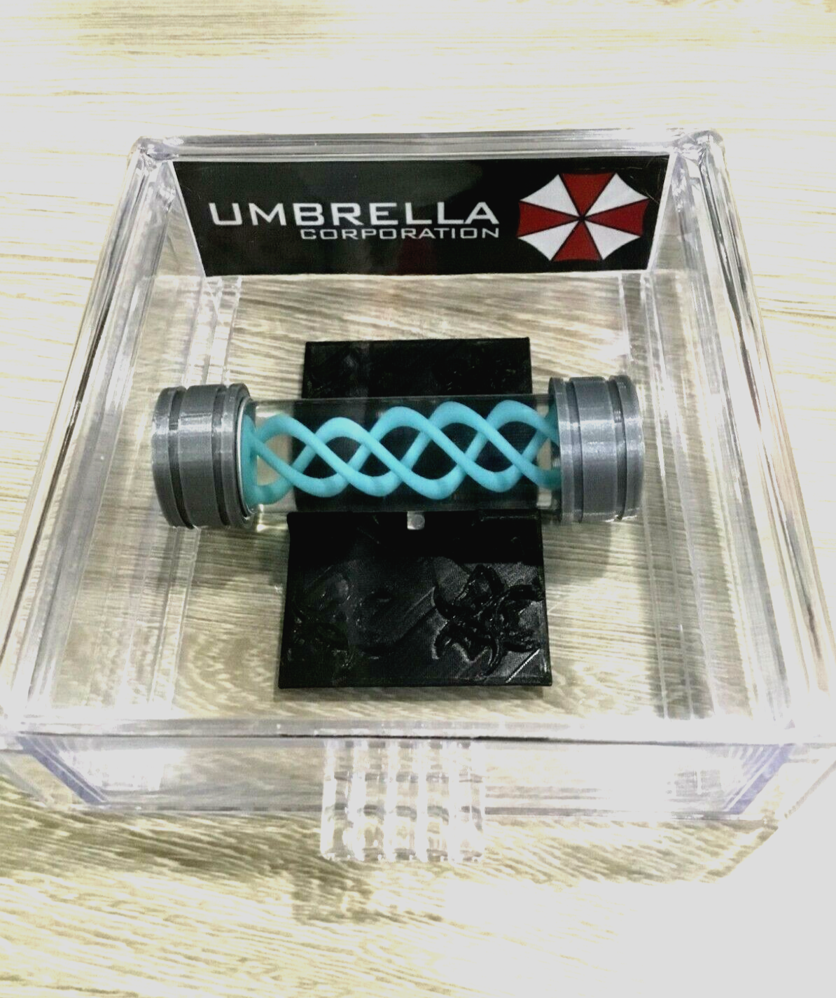 Props Come structured in a 20ml Sealed Borosilicate Leak Proof Glass Vial. Also comes with a Display Stand and Display case With Pull Our Drawer stamped with the Famous Umbrella Corporation.