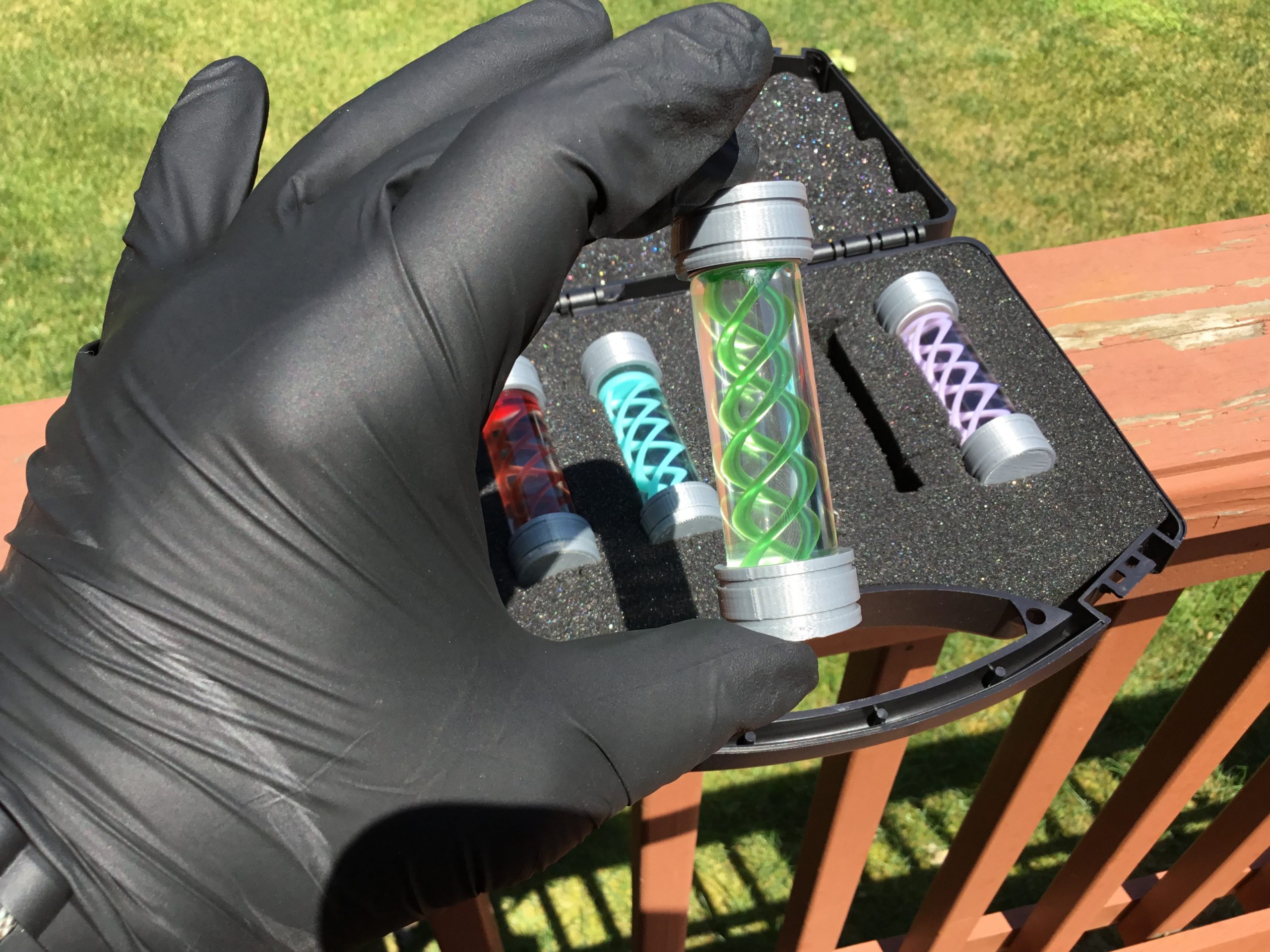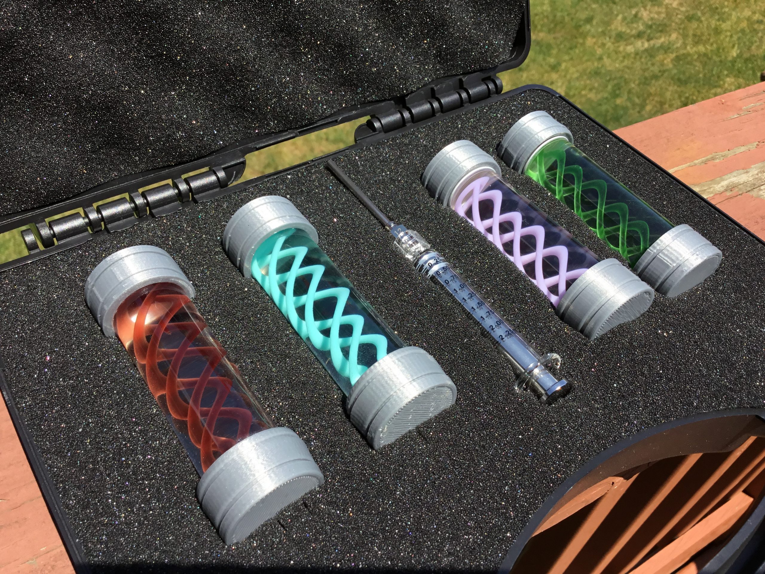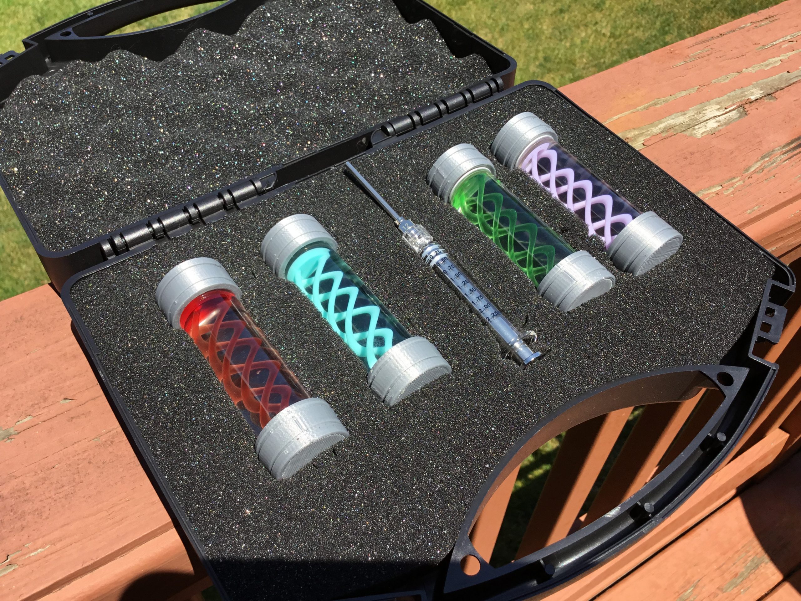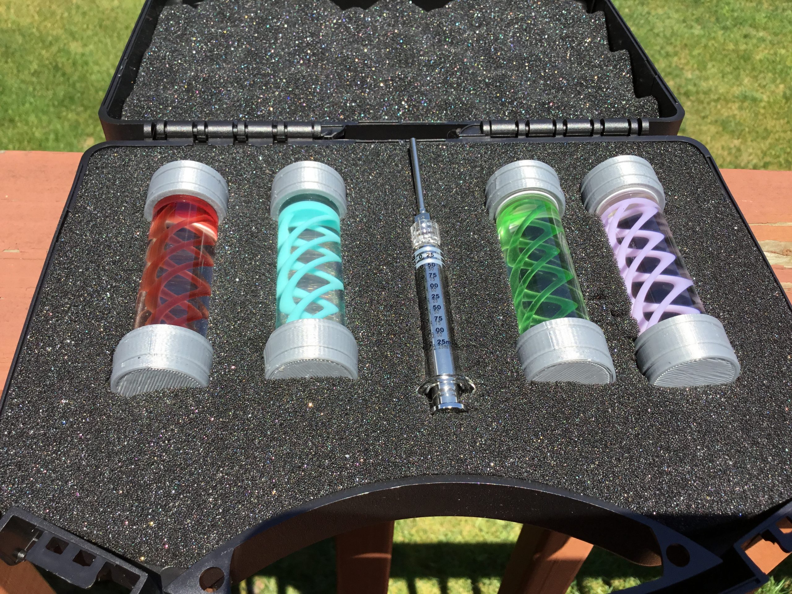 Total of Four Vials with the following Colors inside as shown. Blue, Green, Purple, Red.