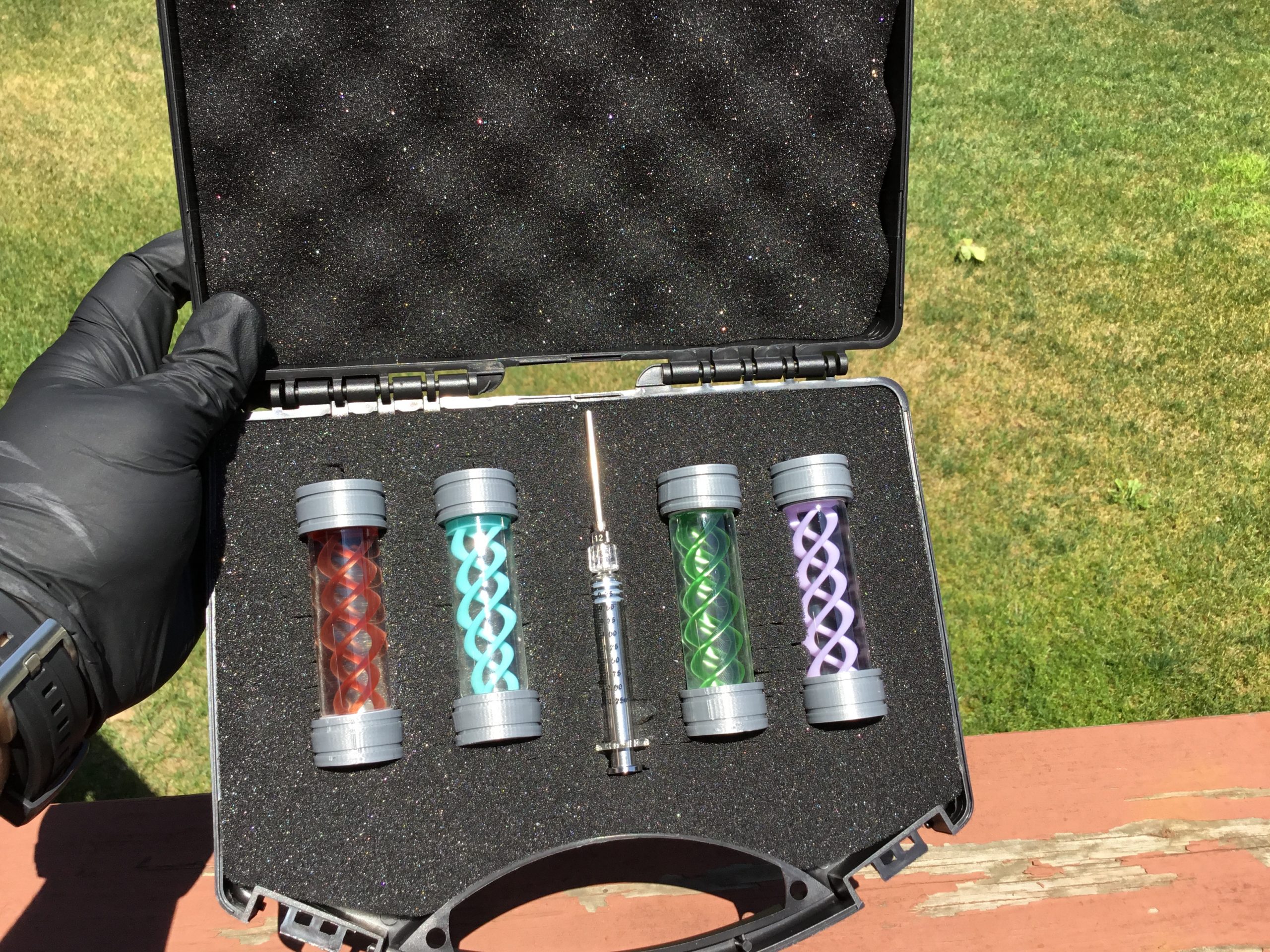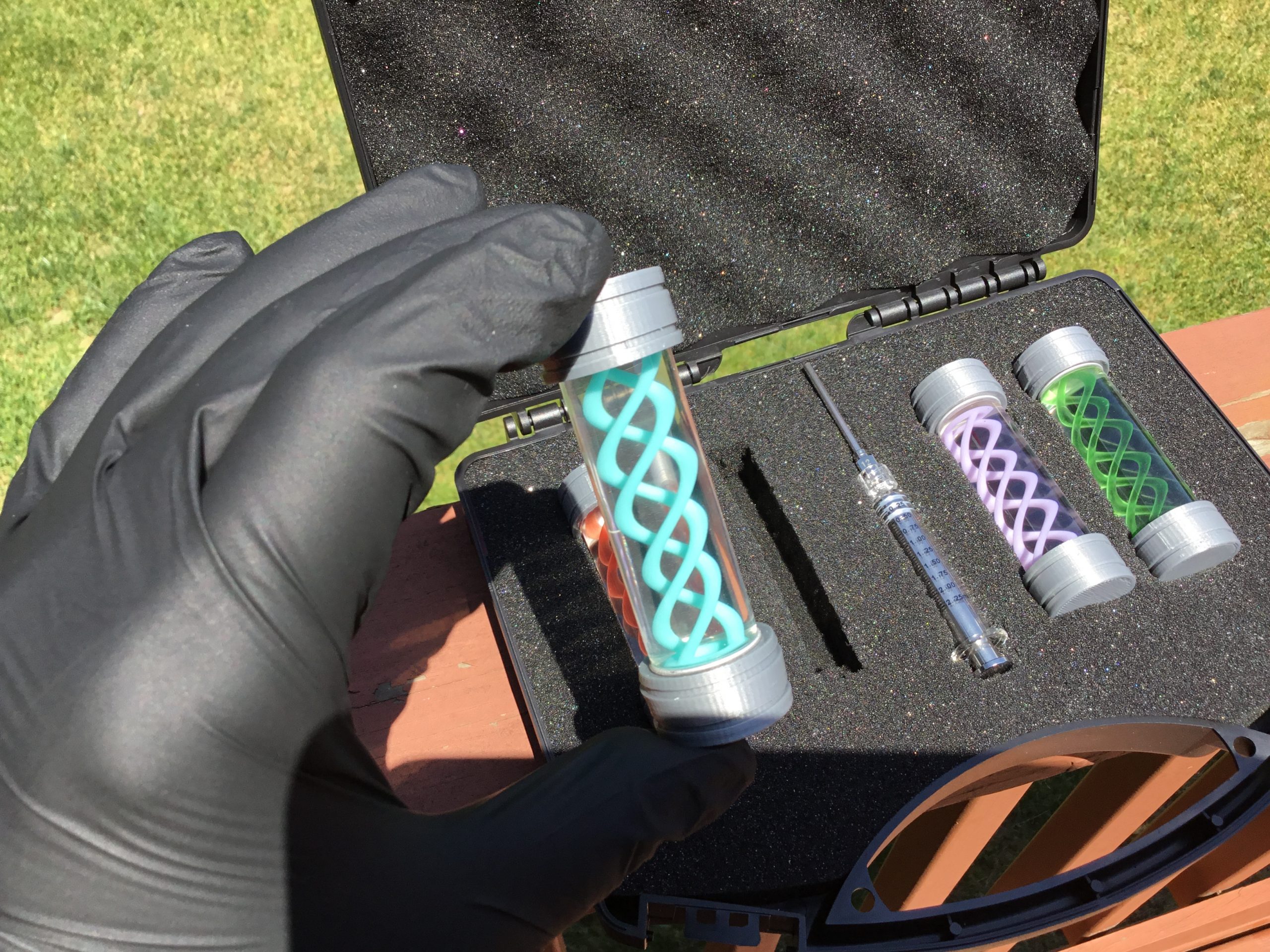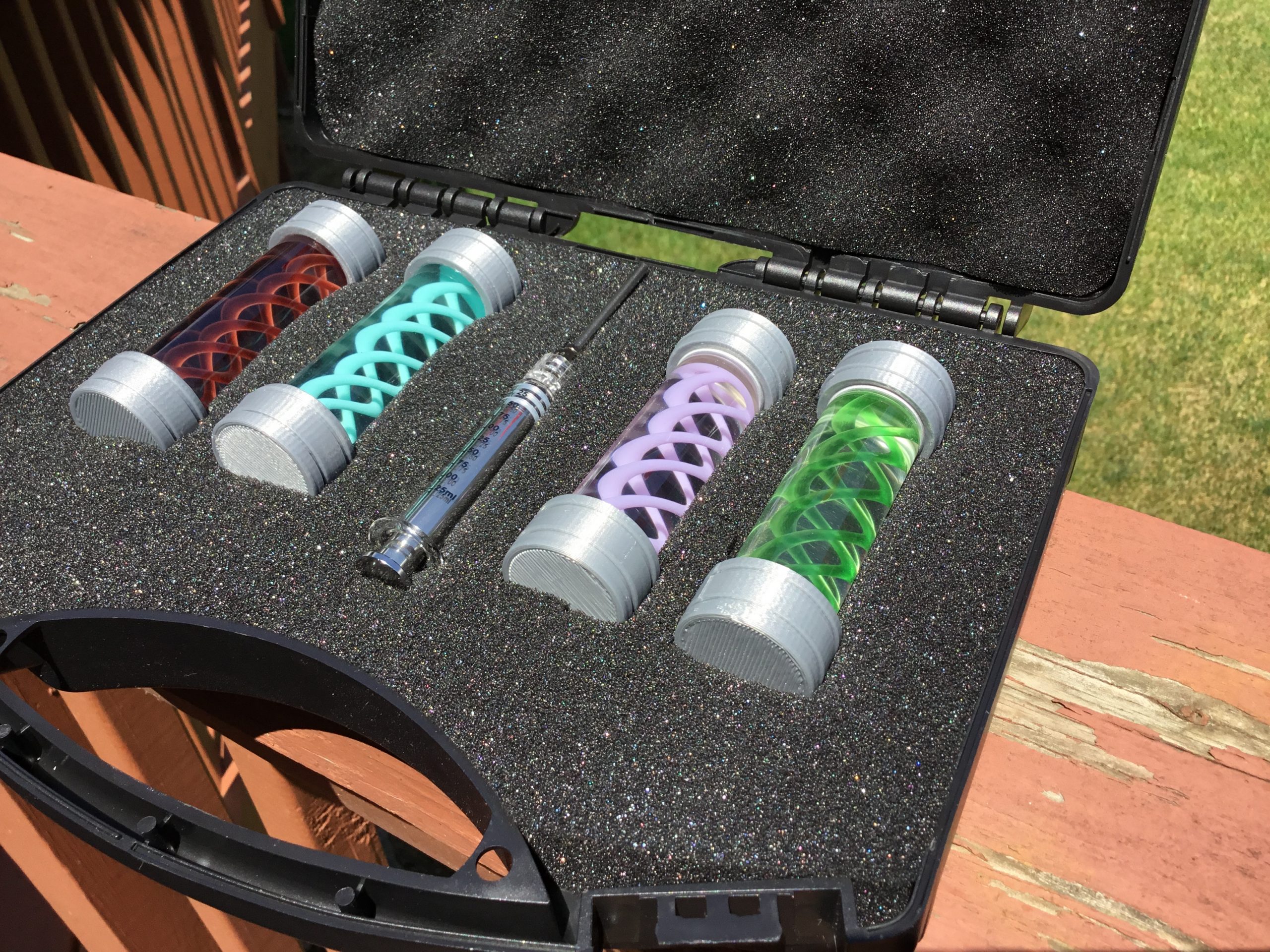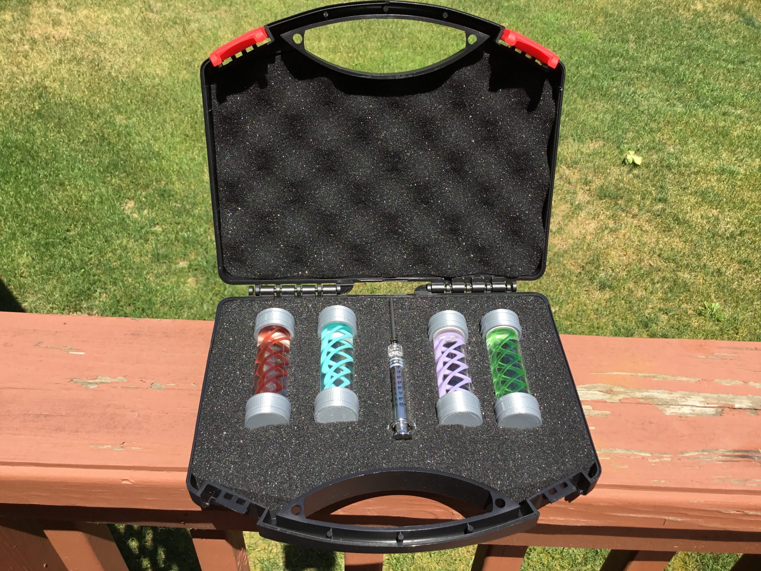 Total of Four Vials with the following Colors inside as shown. Blue, Green, Purple, Red.