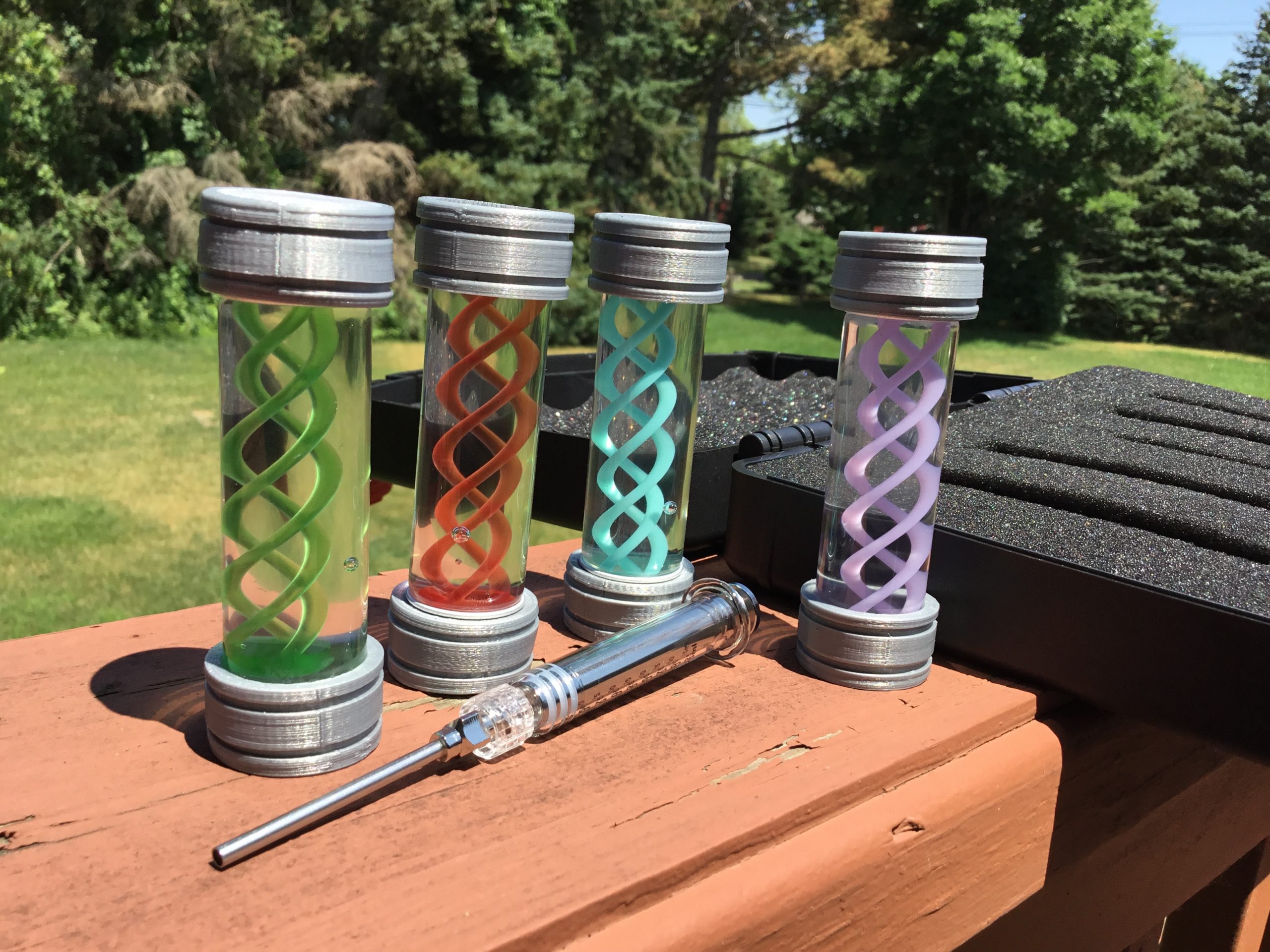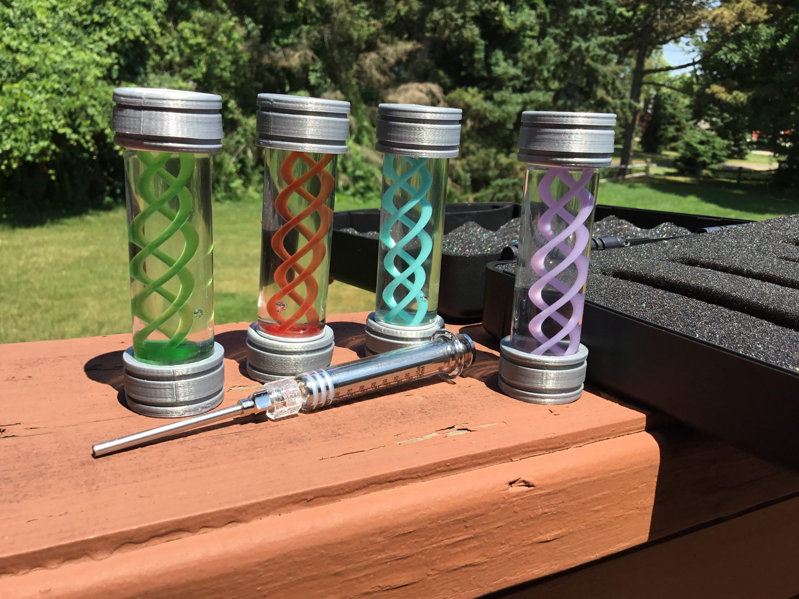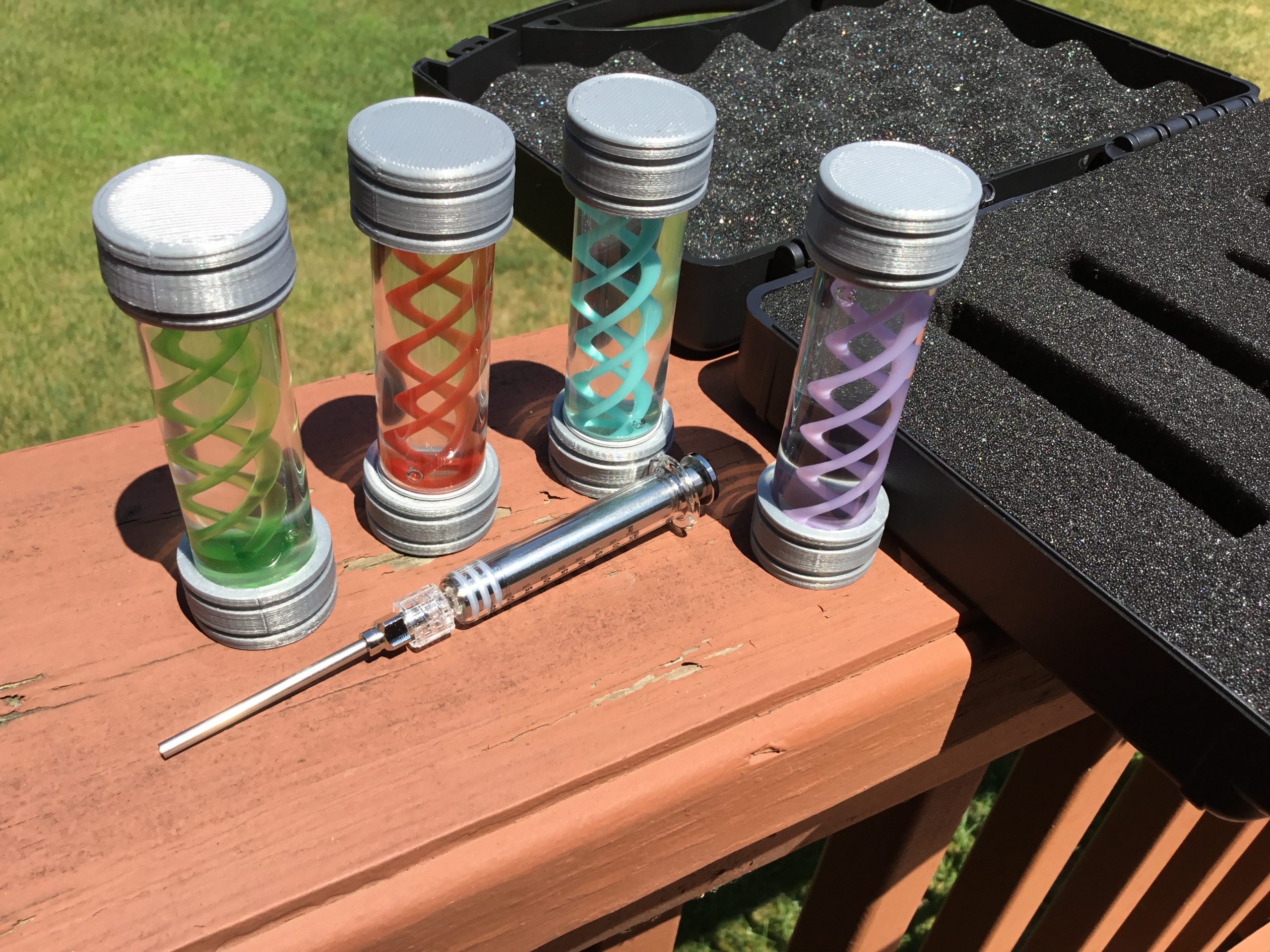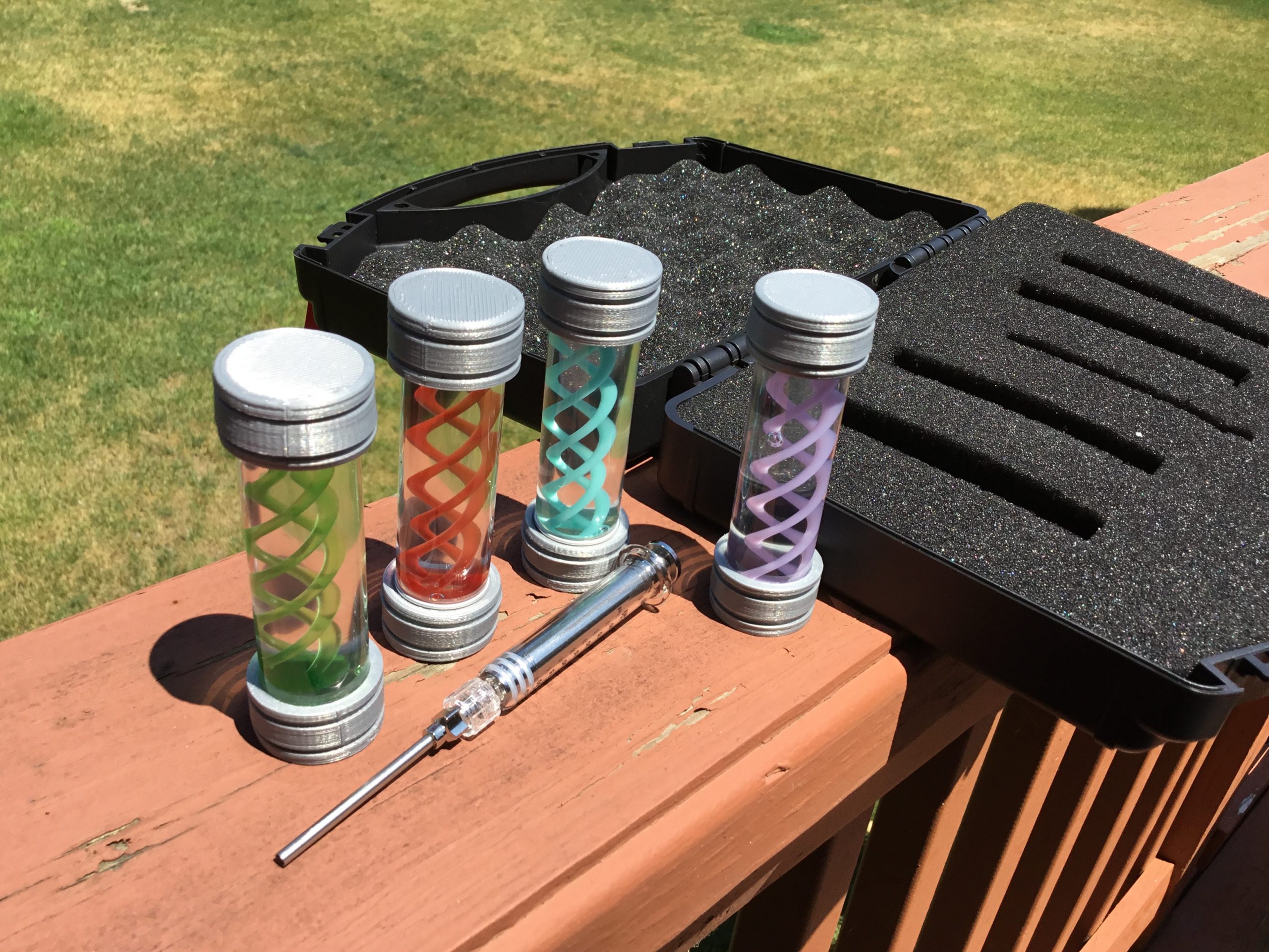 Total of Four Vials with the following Colors inside as shown. Blue, Green, Purple, Red.