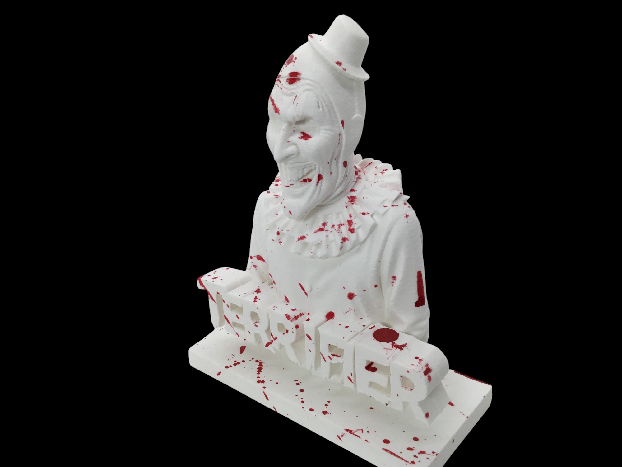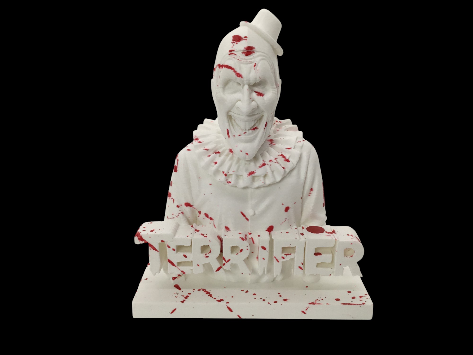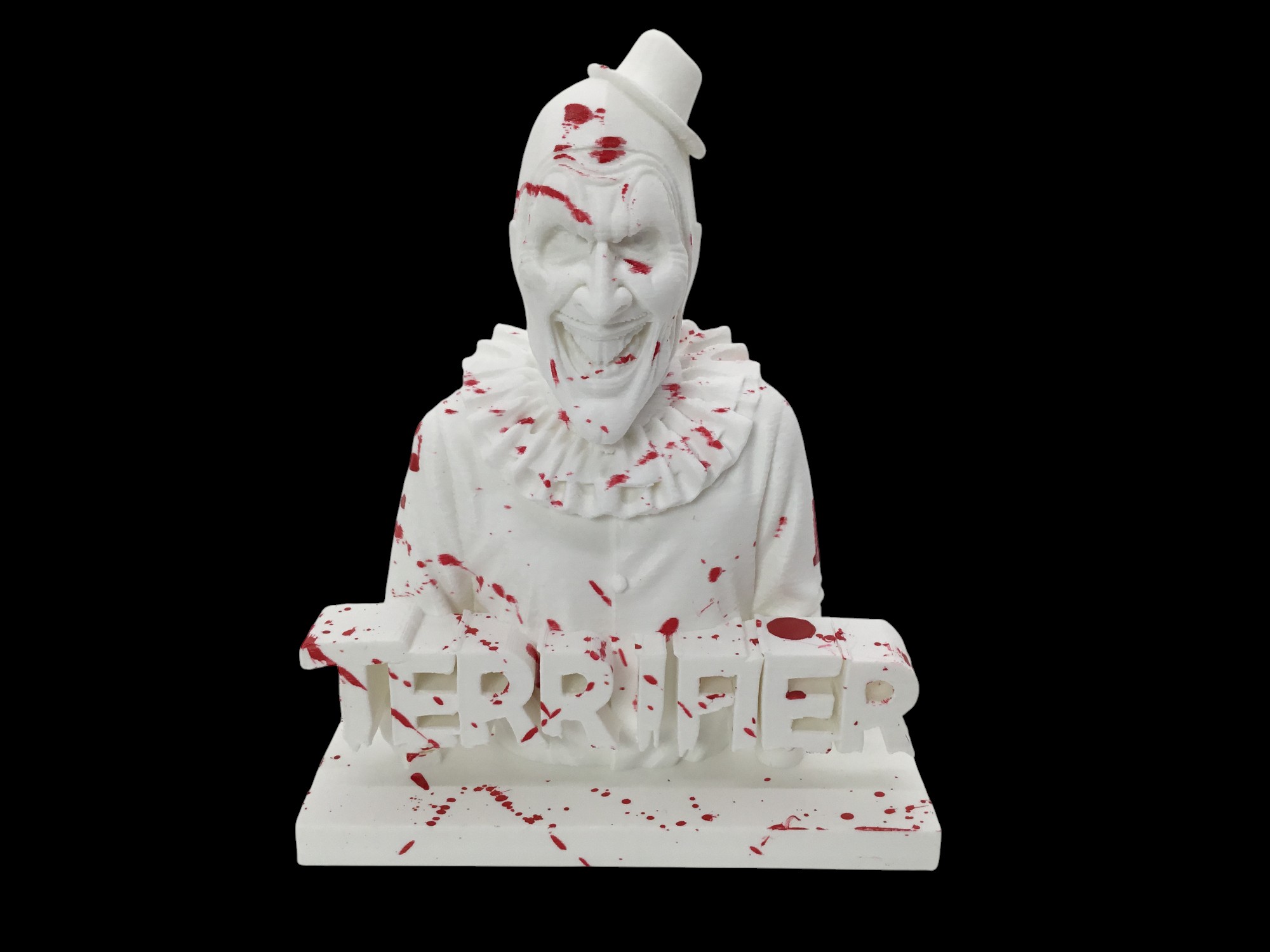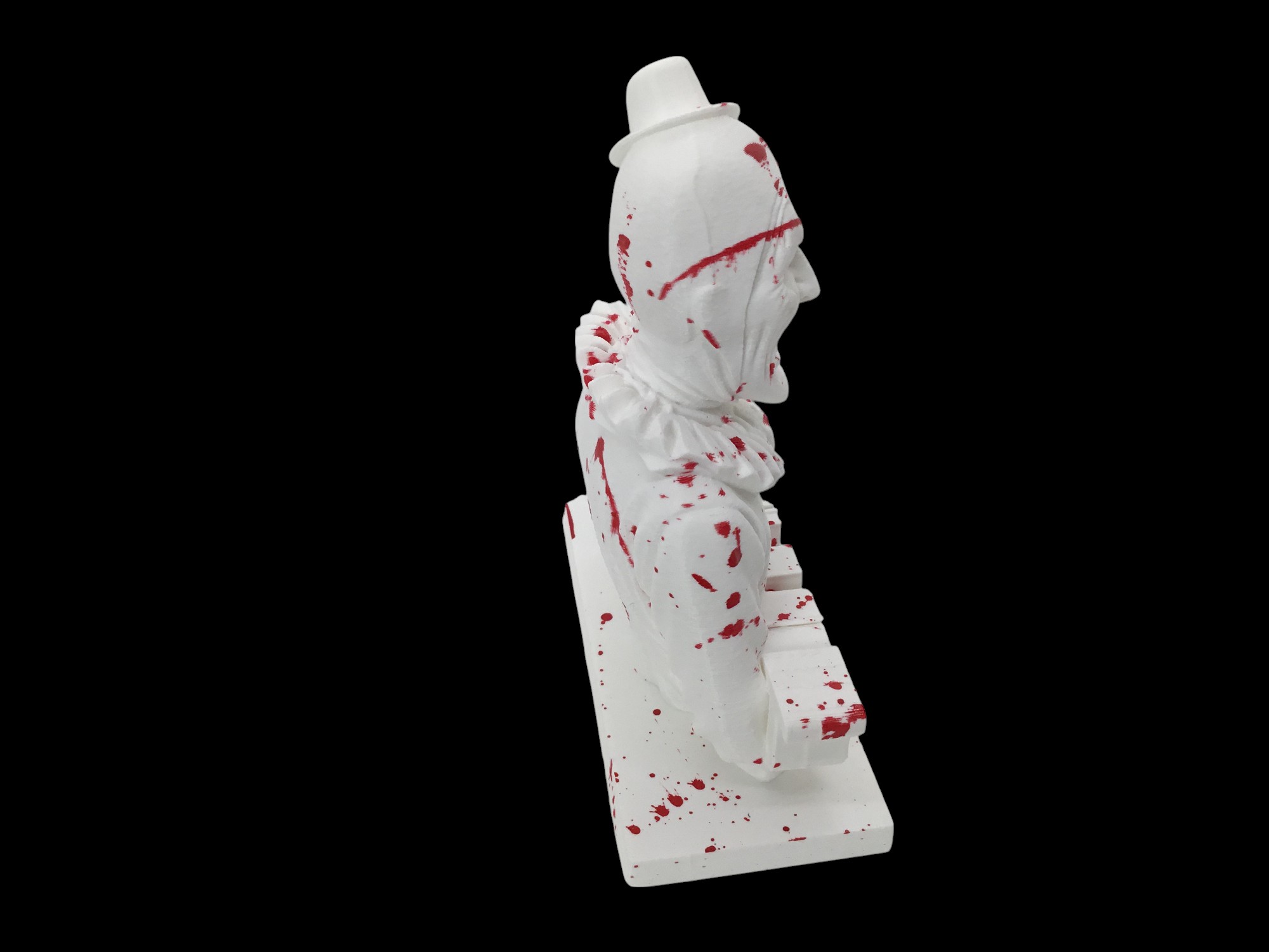 Bring true horror to your collection with this Terrifier Art the Clown display bust. Standing approximately 6.1 inches tall and 5.25 inches wide, this chilling piece captures the infamous killer clown in striking detail. Crafted in stark white with hand-applied realistic blood splatter accents, it perfectly embodies the twisted terror of the cult-classic Terrifier films.