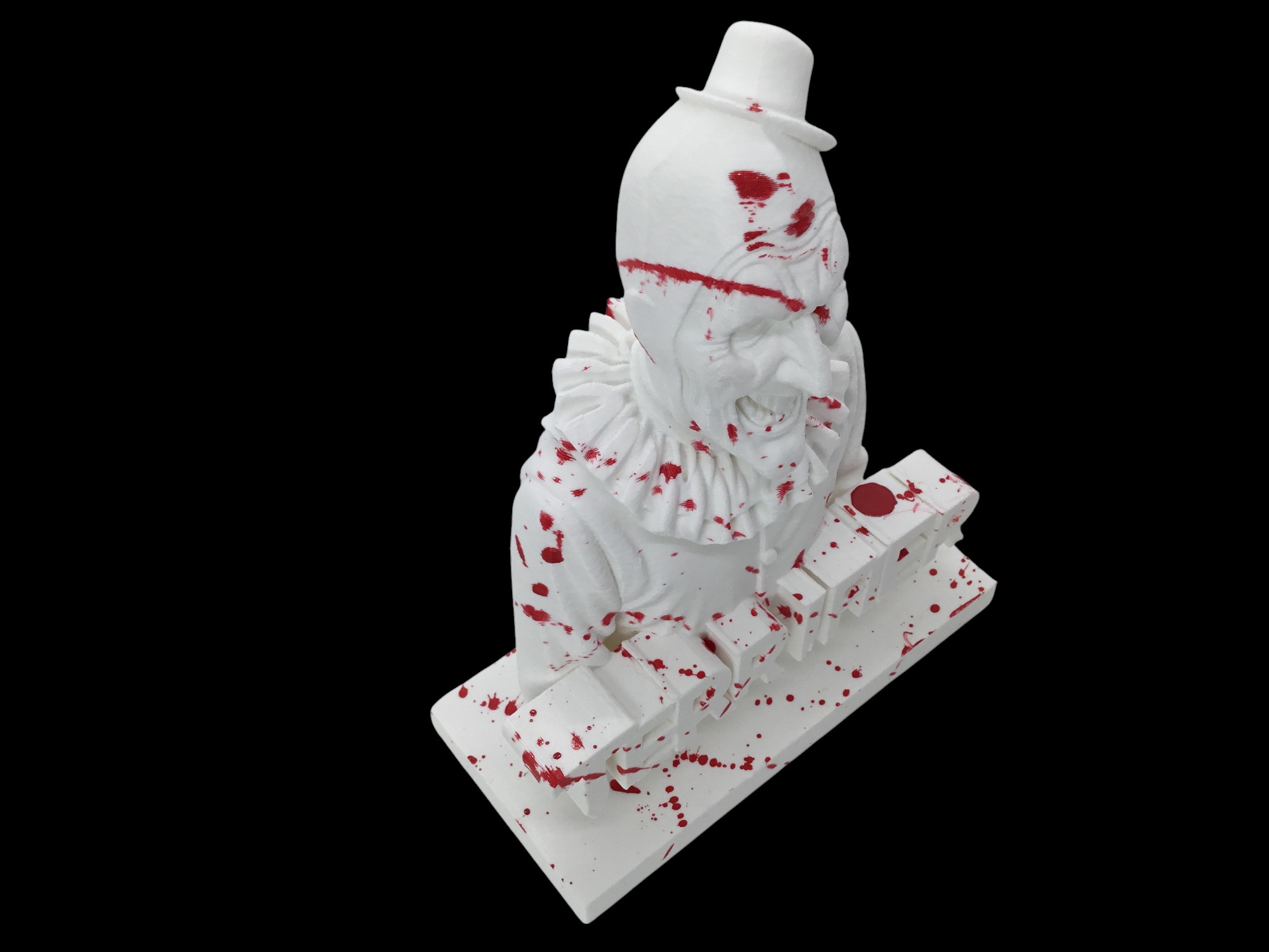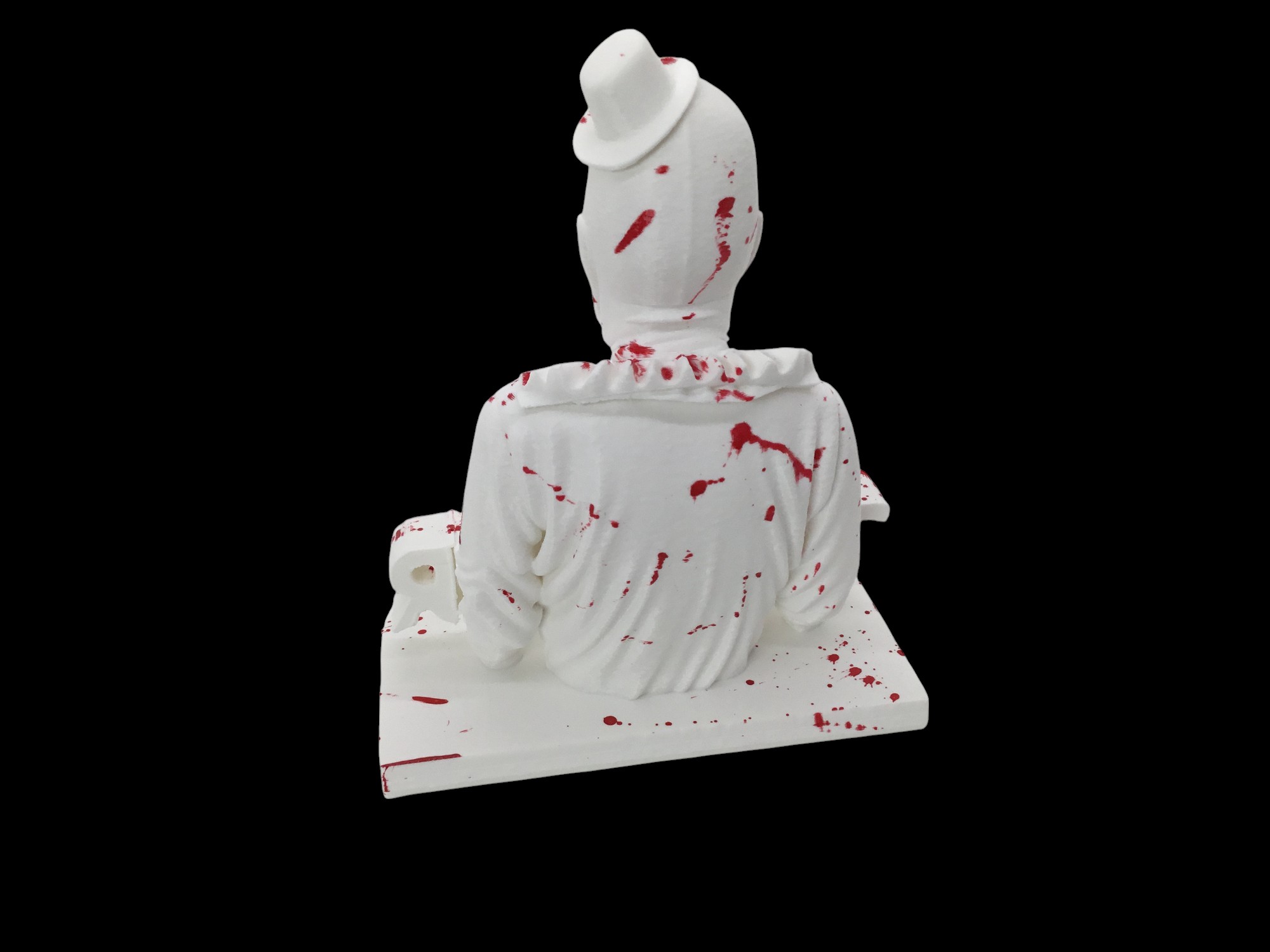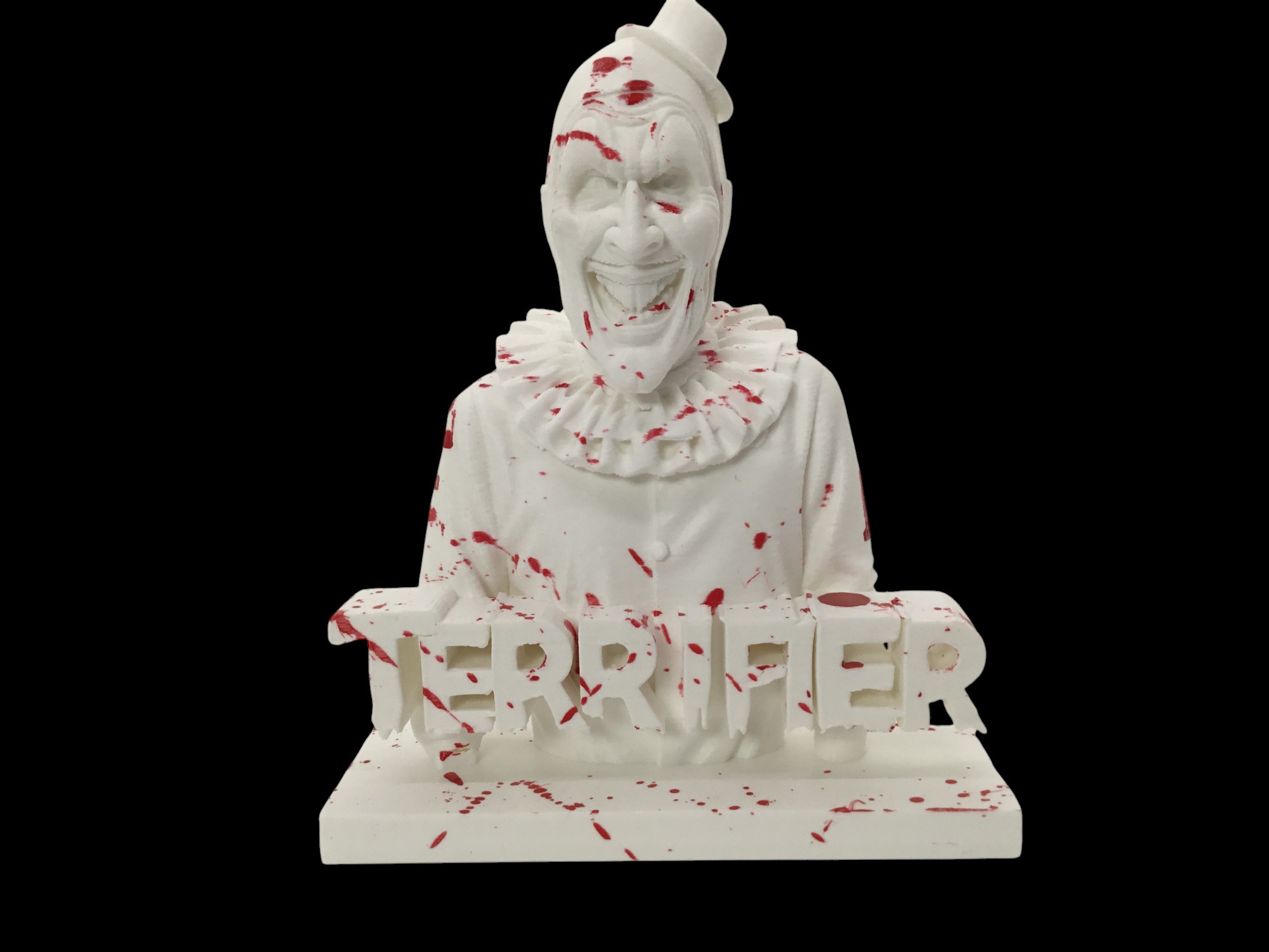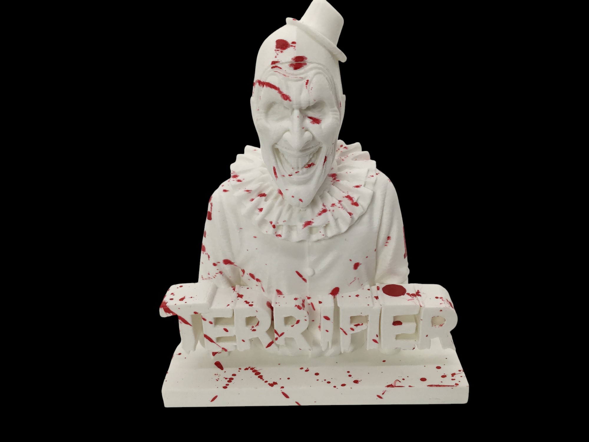 Bring true horror to your collection with this Terrifier Art the Clown display bust. Standing approximately 6.1 inches tall and 5.25 inches wide, this chilling piece captures the infamous killer clown in striking detail. Crafted in stark white with hand-applied realistic blood splatter accents, it perfectly embodies the twisted terror of the cult-classic Terrifier films.