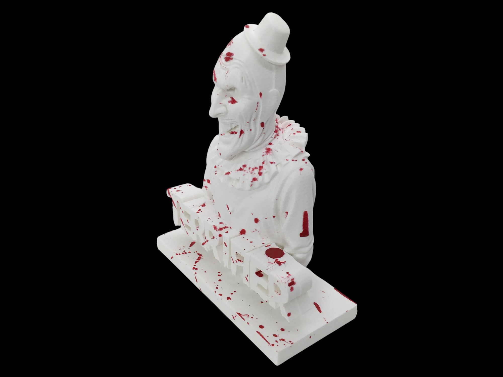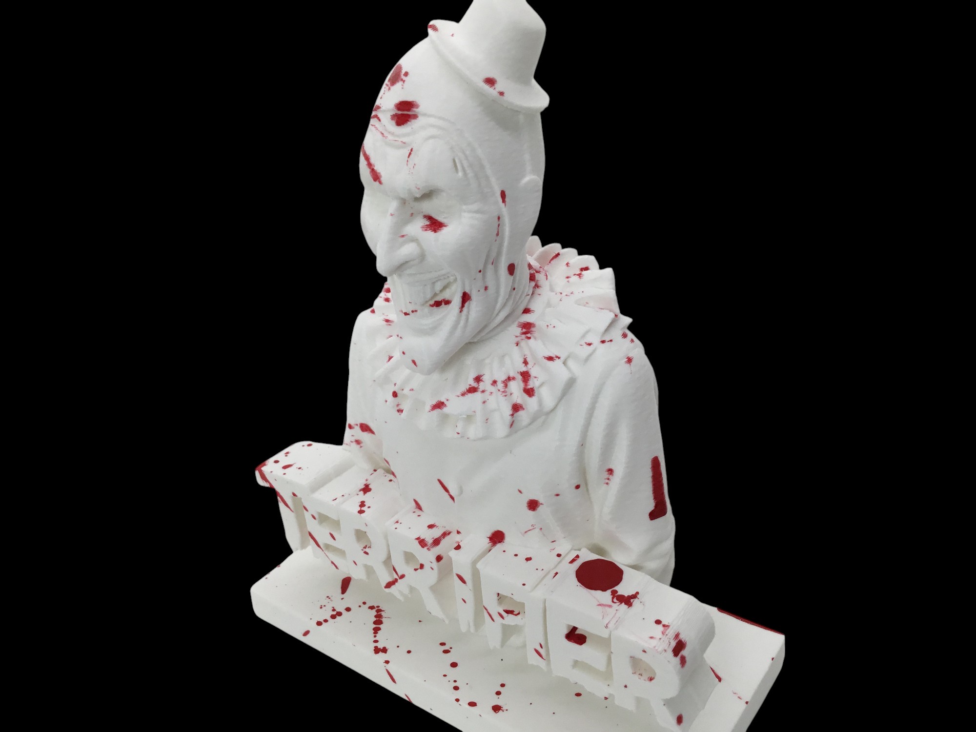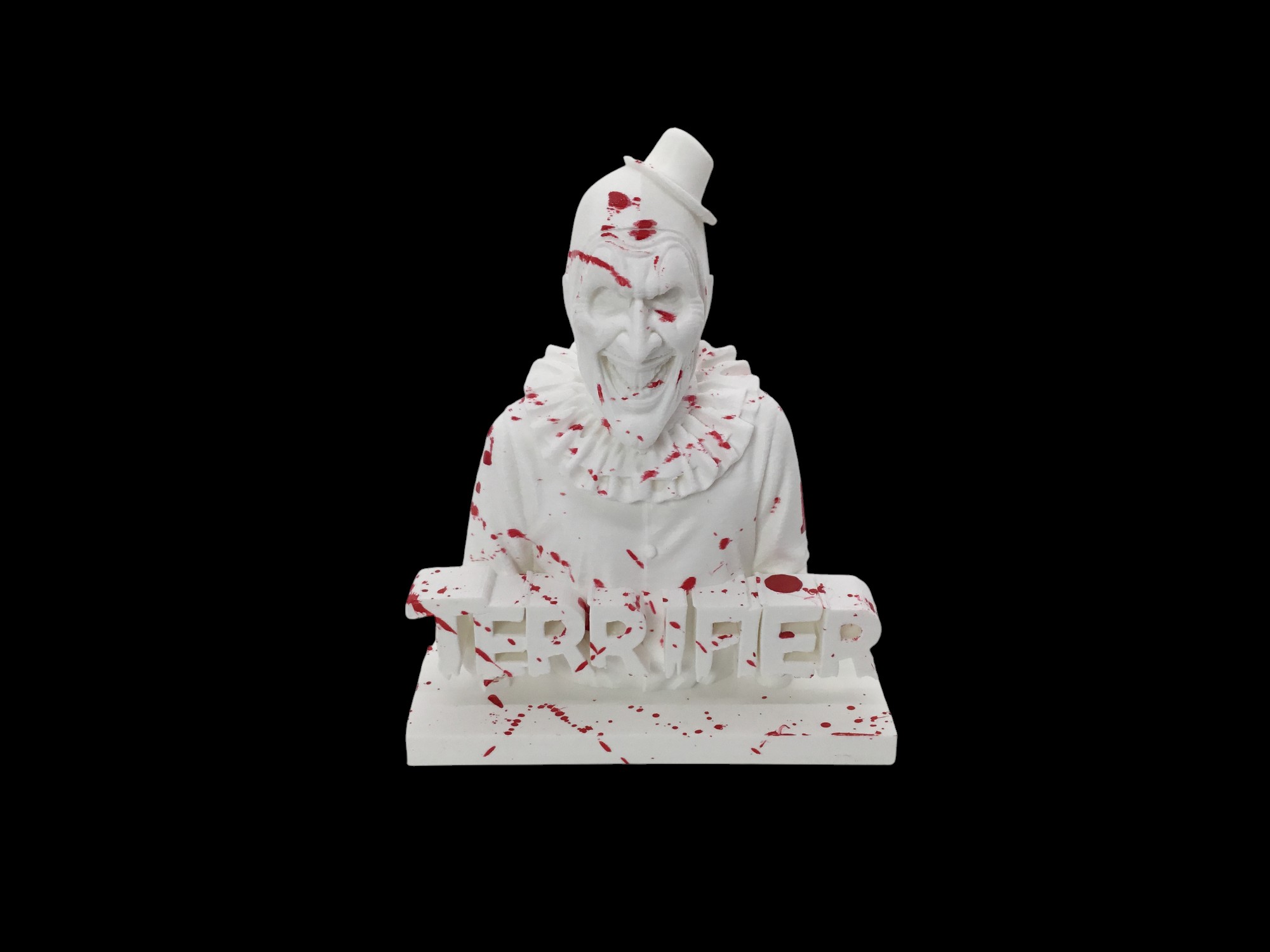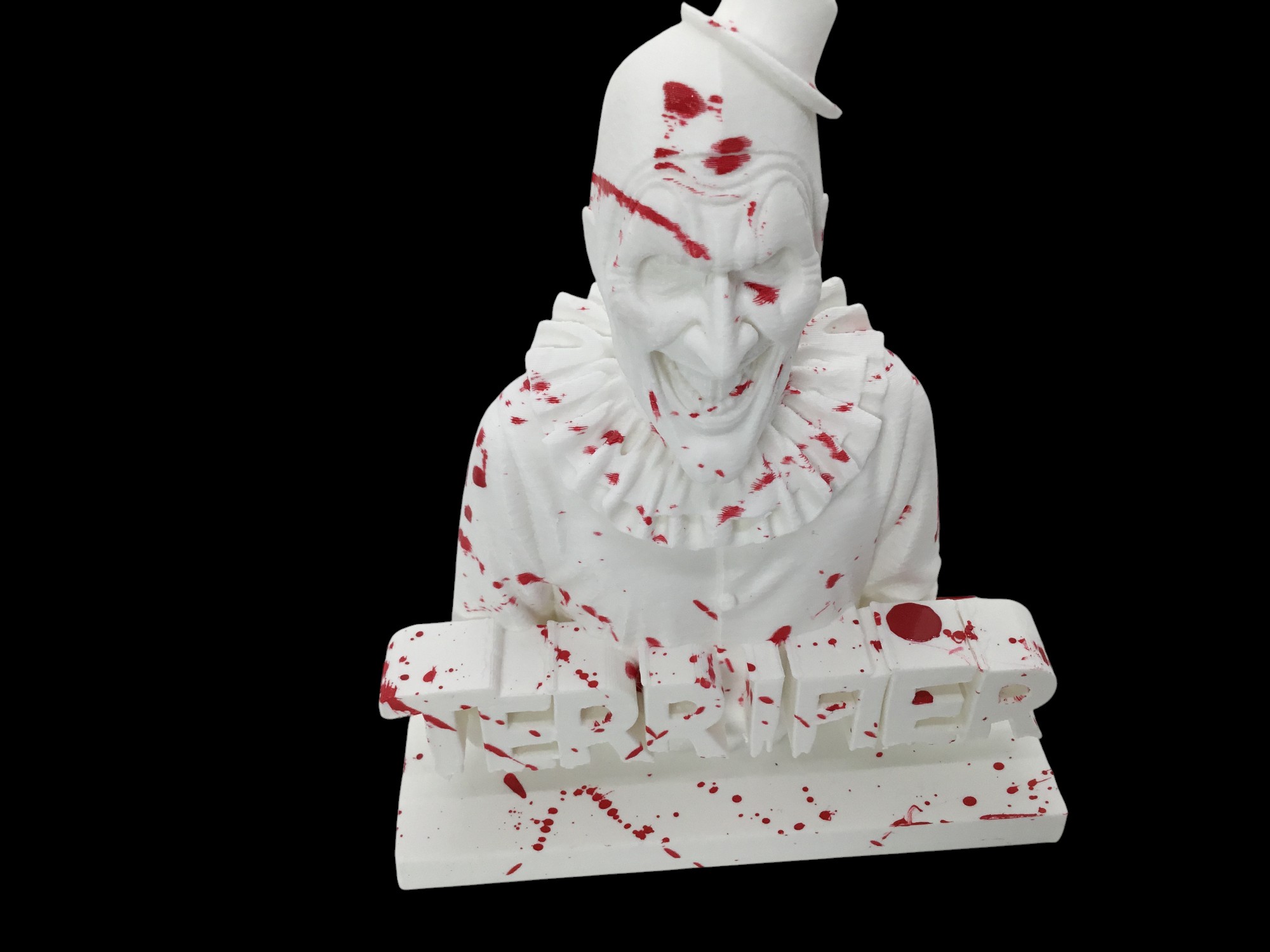 Bring true horror to your collection with this Terrifier Art the Clown display bust. Standing approximately 6.1 inches tall and 5.25 inches wide, this chilling piece captures the infamous killer clown in striking detail. Crafted in stark white with hand-applied realistic blood splatter accents, it perfectly embodies the twisted terror of the cult-classic Terrifier films.